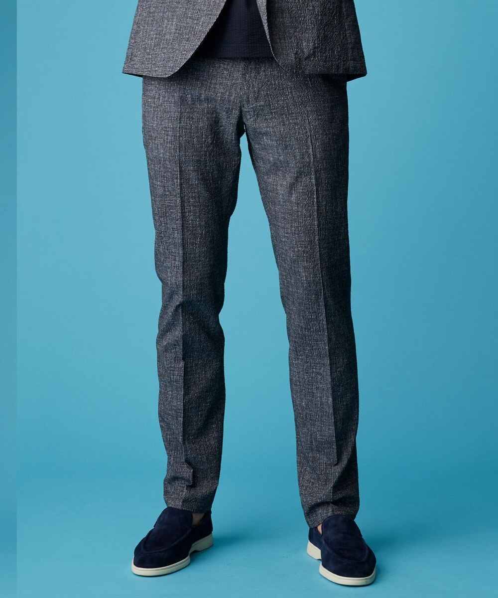 東レの高機能素材を使用。強撚ポリエステル糸によって、サマーウールのような美しい深みのある色合いと、麻のドライ感を見事に表現。軽量でありながらストレッチ性に優れており、肌離れの良さや快適な着心地を実現しています。加えて、吸水速乾性やイージーケア(家庭洗濯可)性にも優れており、ドライタッチや接触冷感機能も備えていますので、暑い季節でも快適に過ごせます。