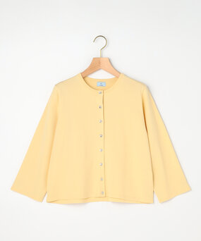 畦編みニット×パール釦が新しいデザイン。首元のパール釦はアクセサリー感覚で華やかに。アイボリーのワントーンでやわらかい春コーデに。