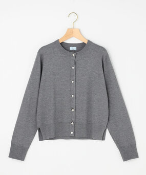 様々なデザインのビジューボタンがアソートされたカーディガン。知的で上品なグレーで簡単にオシャレ見えが叶います。