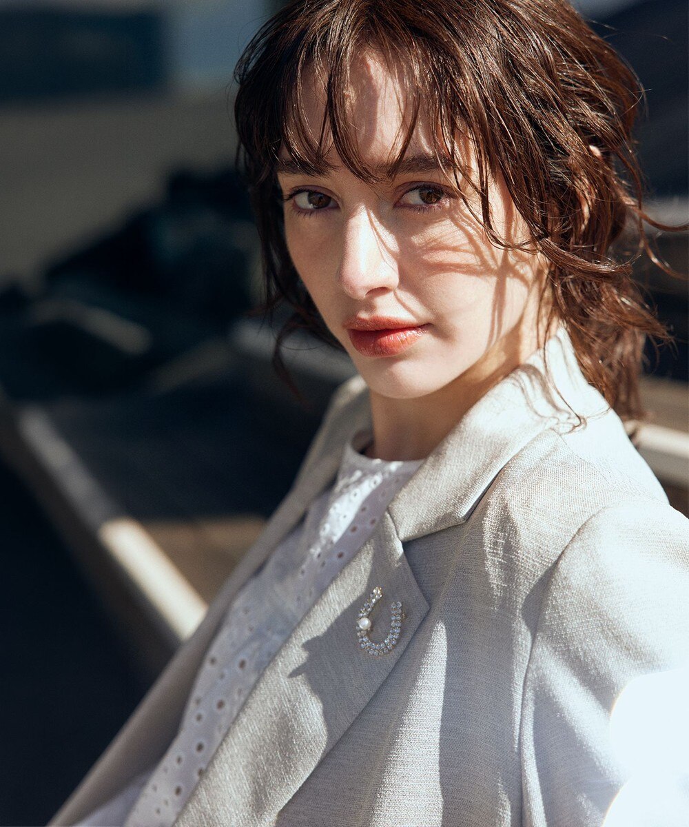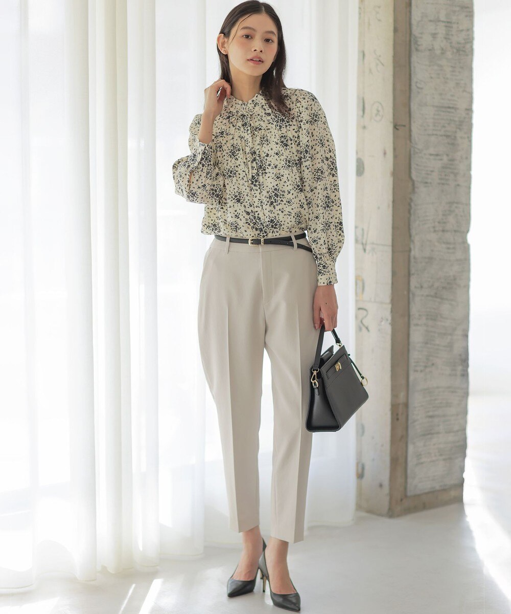 釦を閉めてトップス風に。1枚でももちろん可愛いですが、レイヤードスタイルでより華やかに。シュッと見えパンツは、はき心地の良さと大人のキレイめスタイルを叶えてくれます。