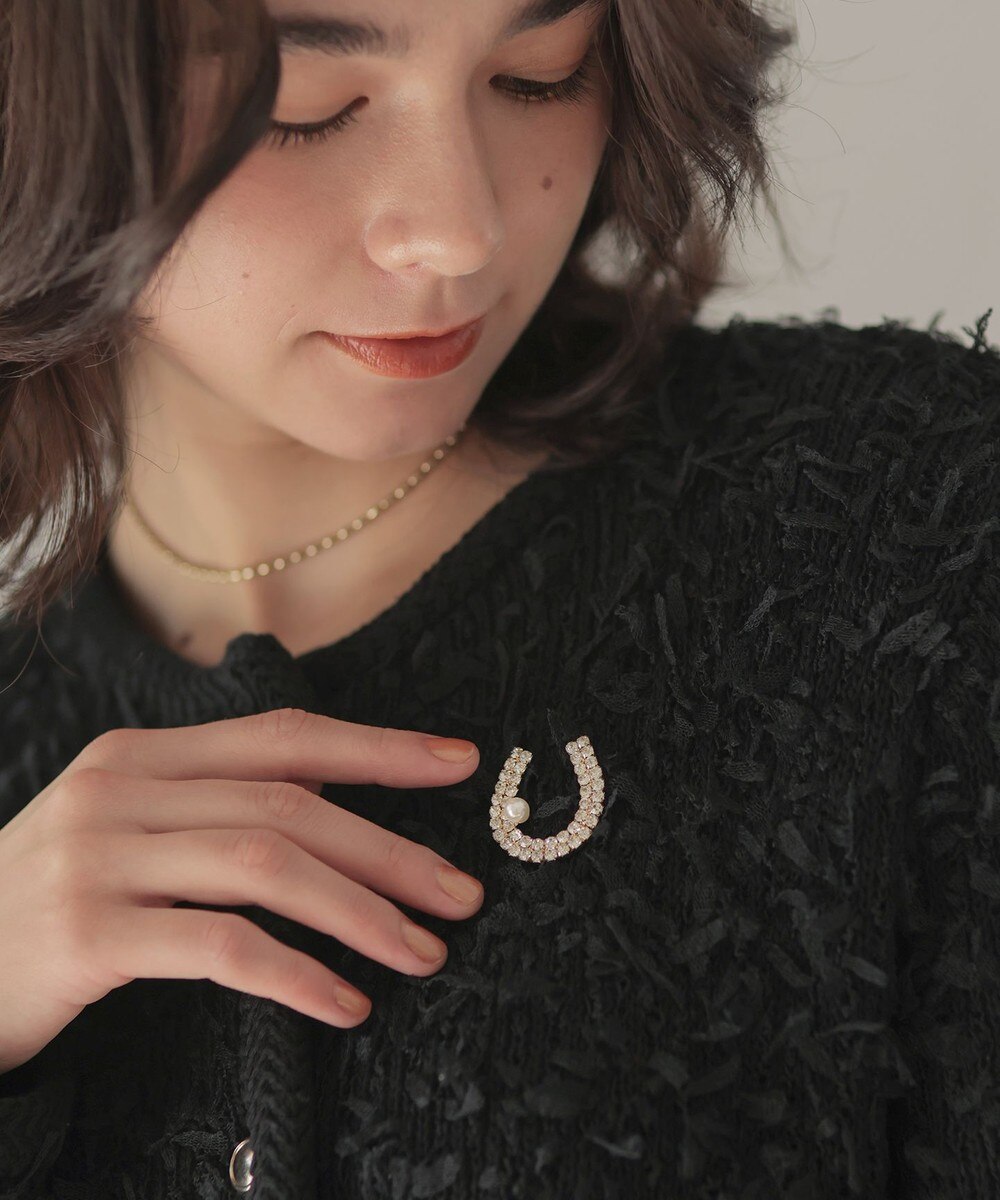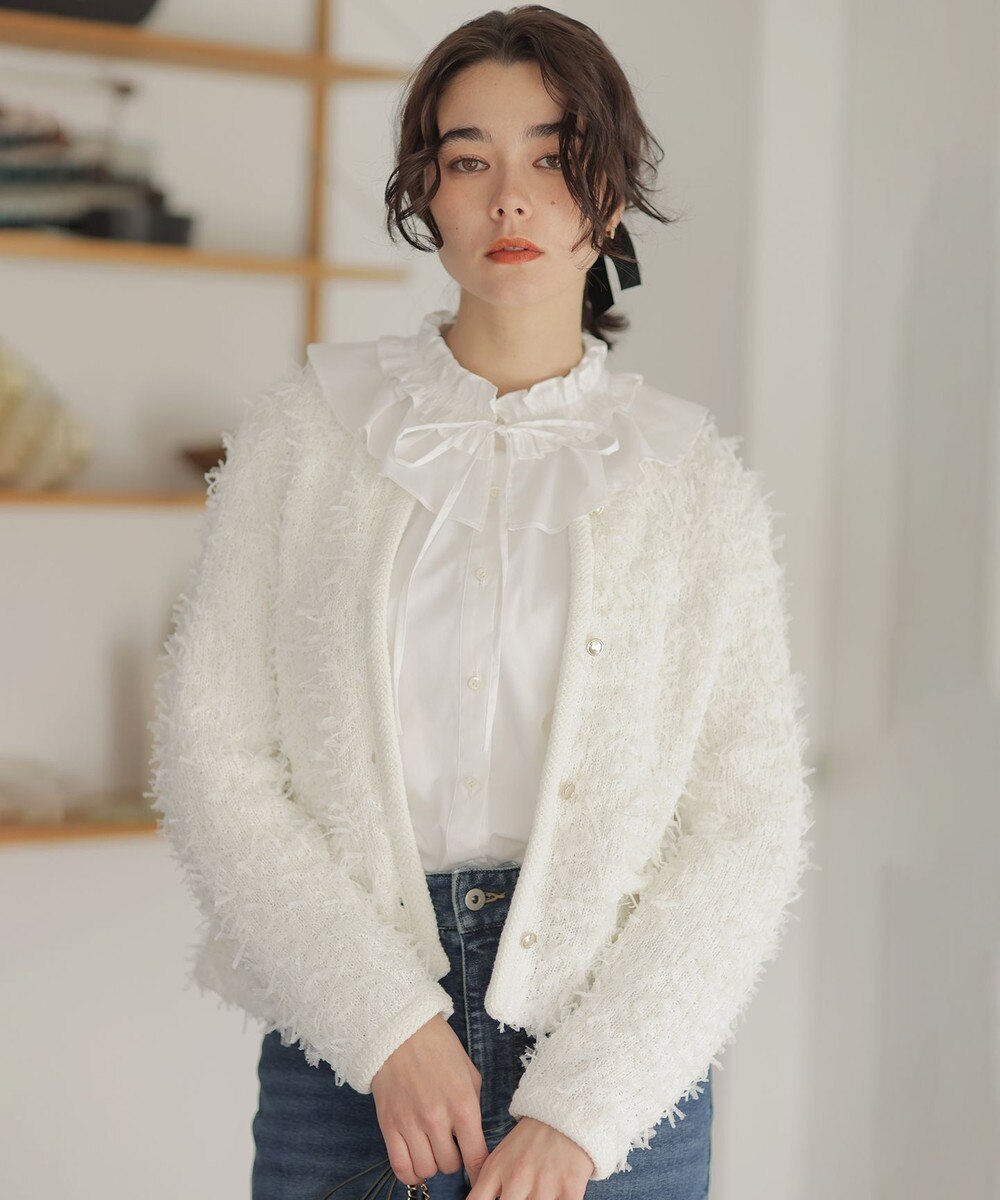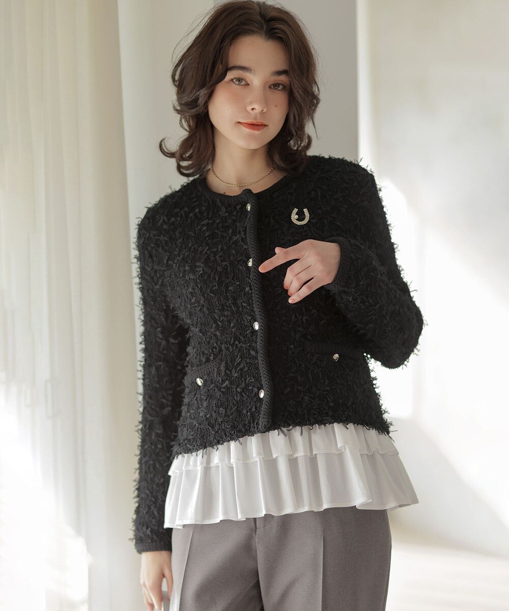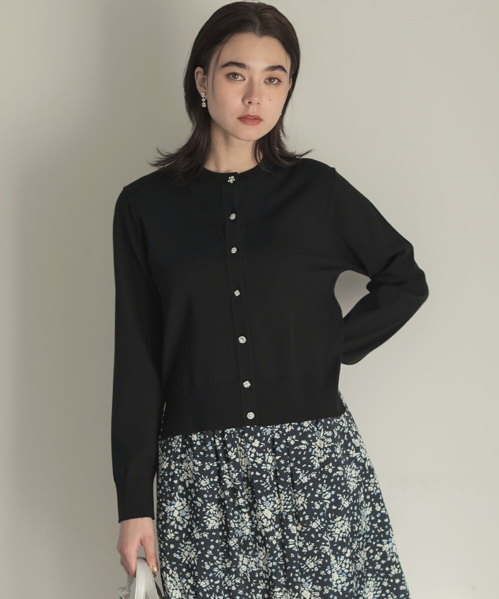 様々なデザインのビジューボタンがアソートされたカーディガン。首や肩が美しく見える絶妙なサイズ感がポイント。ボタンを全て留めてプルオーバーのように着るのがおすすめです。