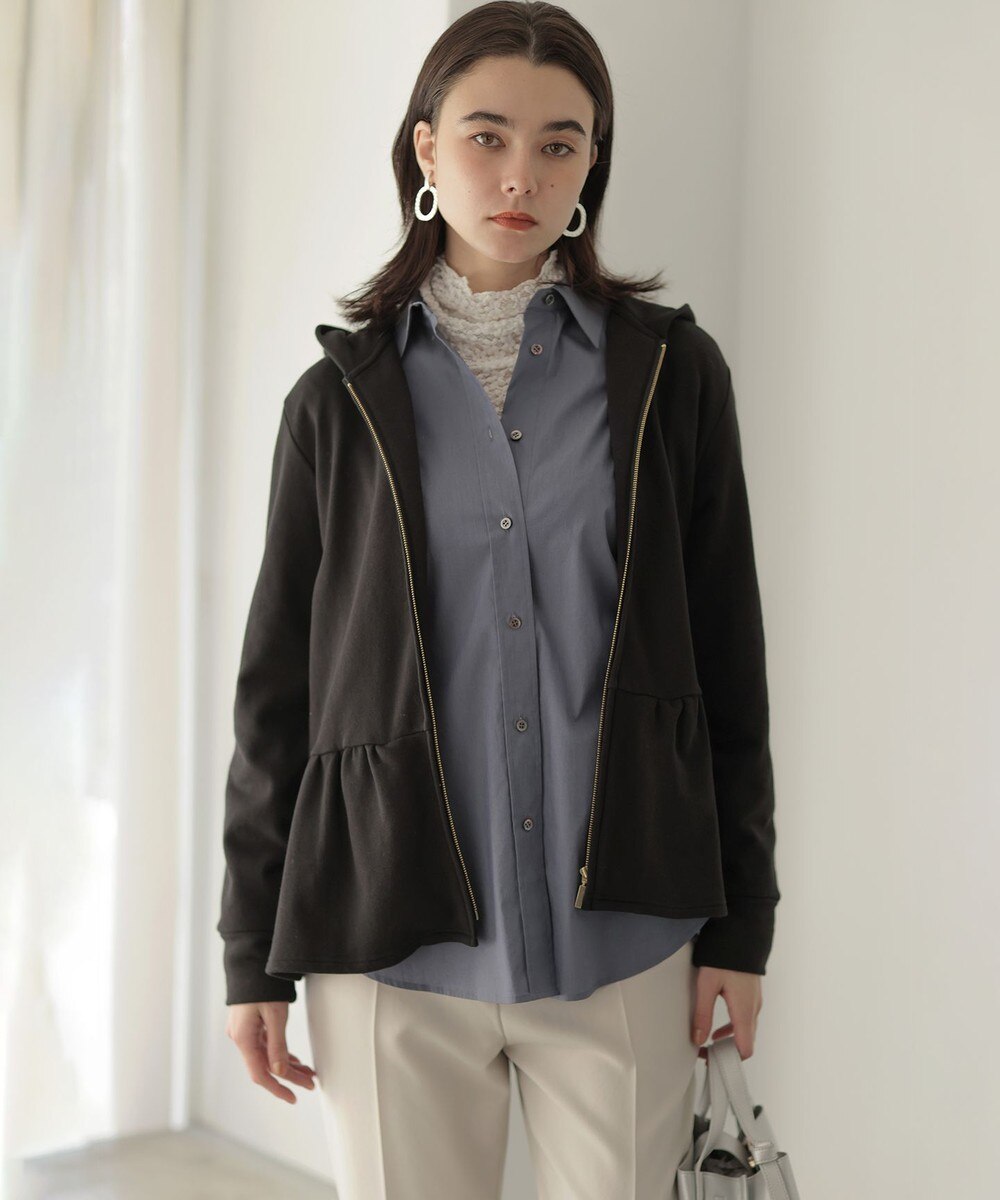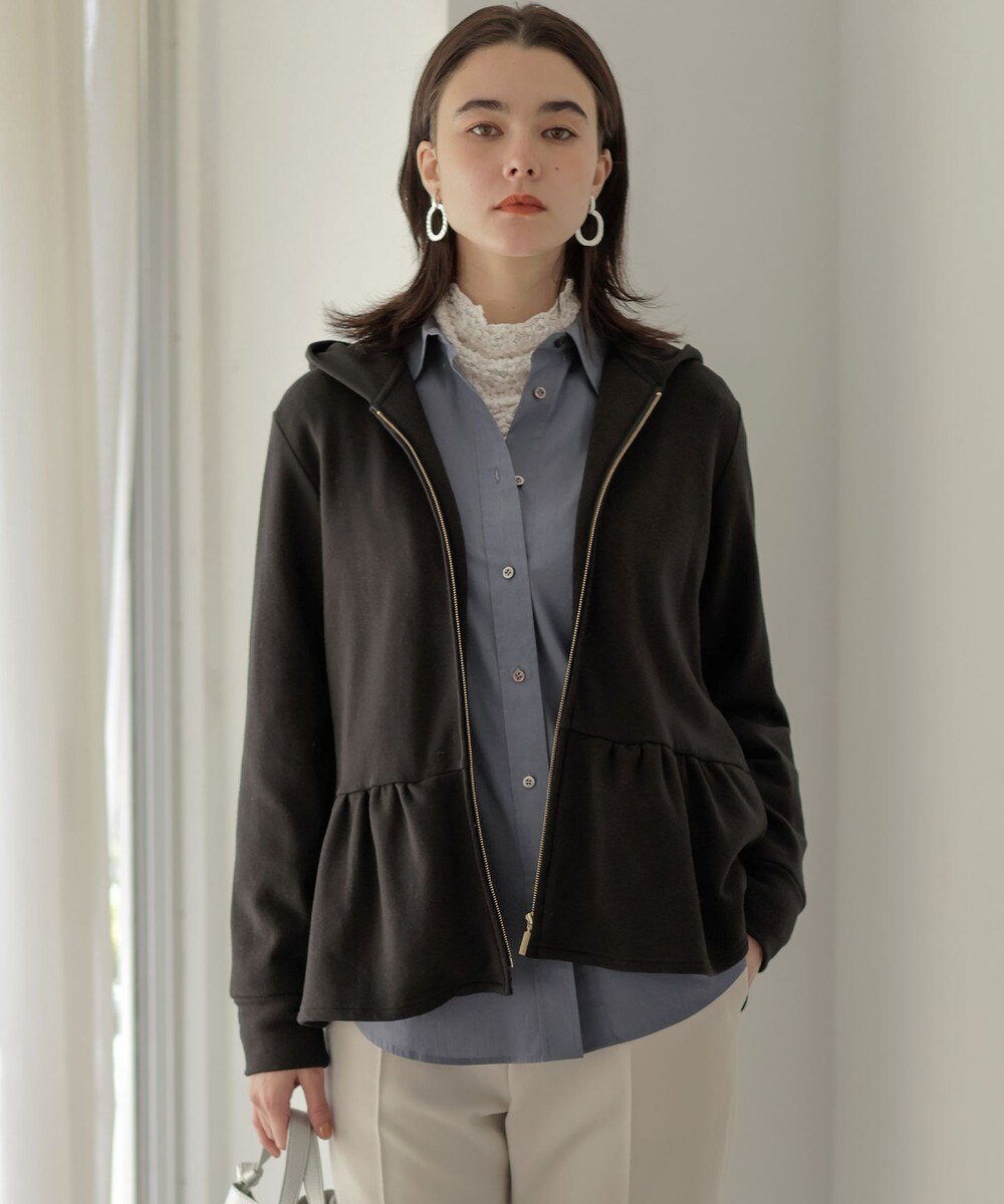 ペプラムギャザーがフェミニンなパーカー。ペプラムのボリューム感で、ウエストやヒップラインもカバーしてくれます。さらっと羽織るだけでスタイリングの主役に。モチふわタッチで快適な着心地です。
