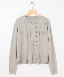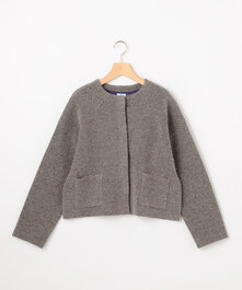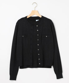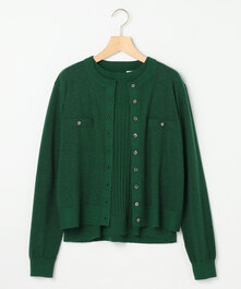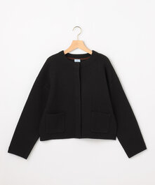 ゆったりとしながら大きく見え過ぎない程よいシルエットのクロップド丈のニットジャケット。下には顔映りが良く清潔感のある女性らしいフリルブラウスを。
