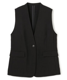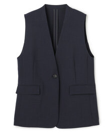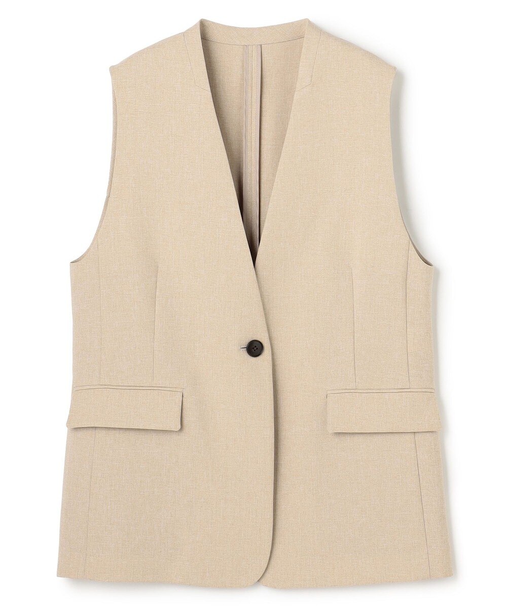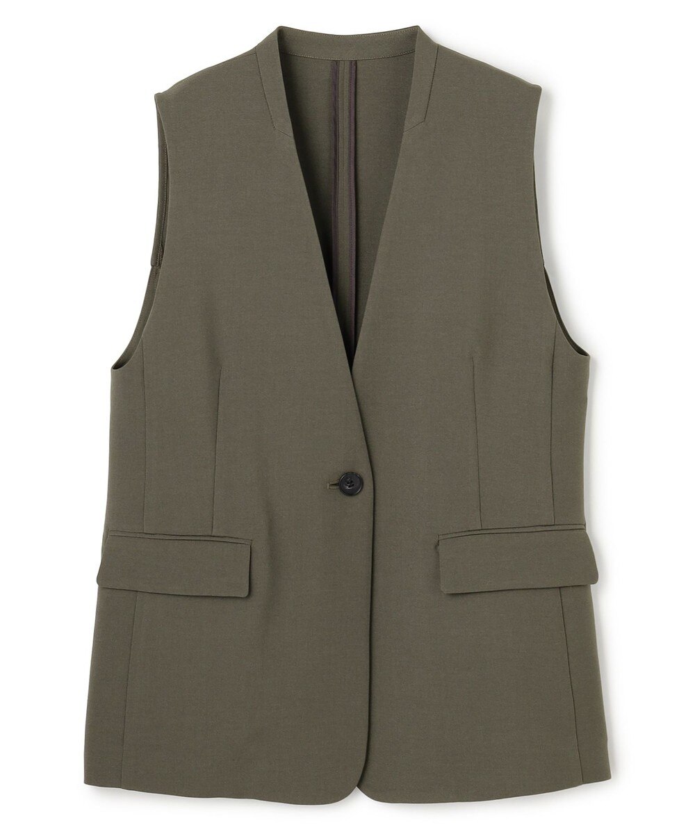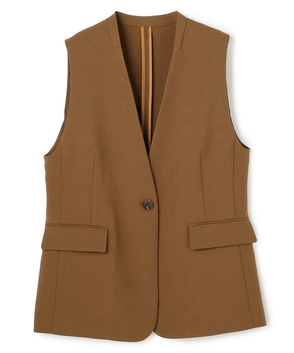 着丈が長めのジレはシングル仕様でクリアな印象に。ミニマルなデザインはスタイリングを選ばない優秀なアイテム。