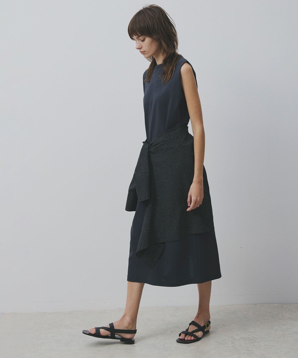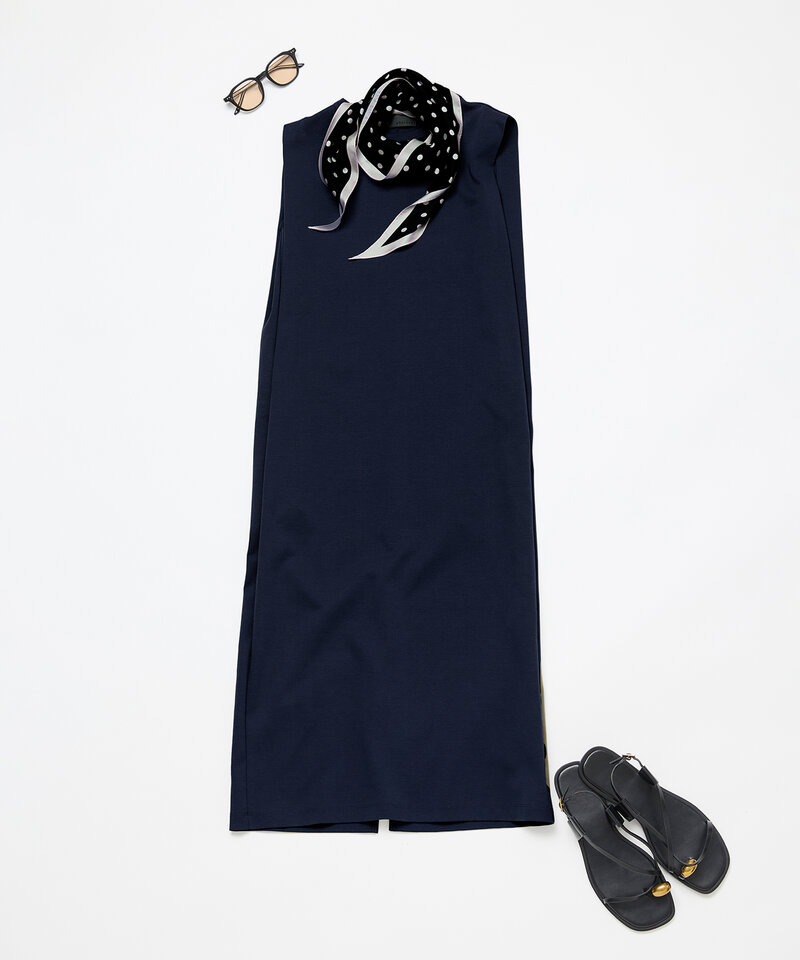ベーシックなカットソーワンピースは素材で勝負。生地のハリ感・肉厚さが体のラインを拾いにくくし、接触冷とUVカットがついた上質なアイテムです。スカーフやアクセサリーで上品に演出を。(ジャージーワンピース¥16,500 ドットスカーフ¥)
