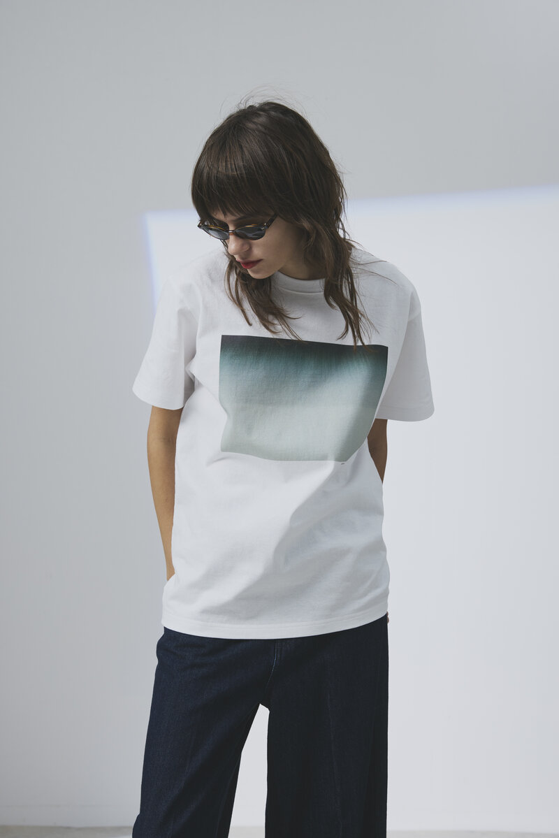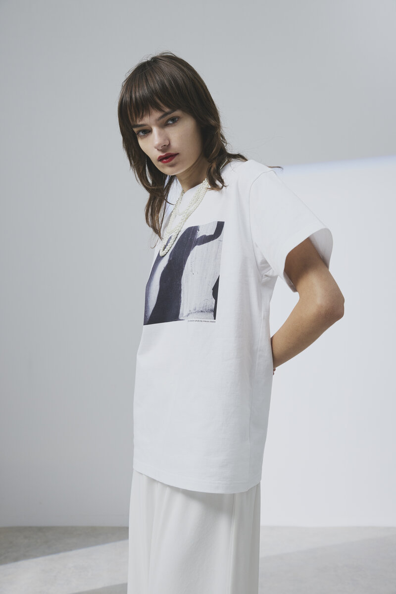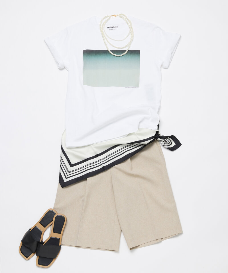 フォトTシャツ+バニューダパンツのスタイリングはカジュアルすぎるから、トレンドのスカーフやパールネックレスで大人の雰囲気にセットアップ。(フォトTシャツ¥9,900 チノギャバジン ショートトラウザー ¥22,000 スクエア シルクスカーフ¥16,500)
