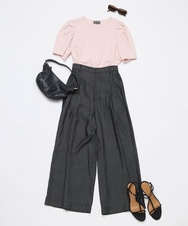 暑い日のお出かけはさらっと1枚で着映えるのが嬉しい! 袖にボリュームを持たせたカットソーはネックラインも華奢なデザインで女子力アップな1枚。(ボリュームカットソー ¥7,920 、デニムパンツ)