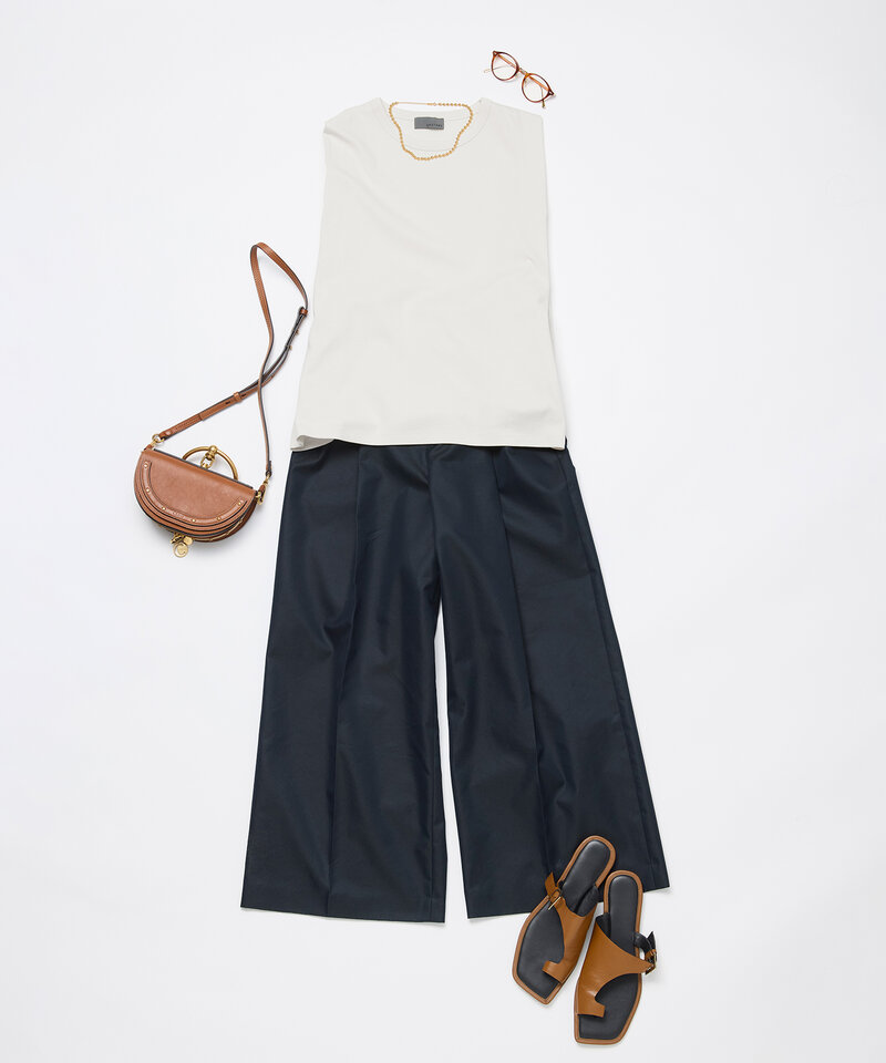 ちょうど良いバランスのシルエットは大き過ぎずコンパクト過ぎず。ノースリーブは袖をだしてヘルシーに、ネックは開けすぎない。
