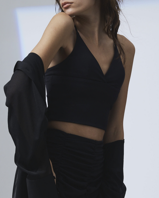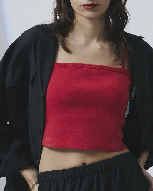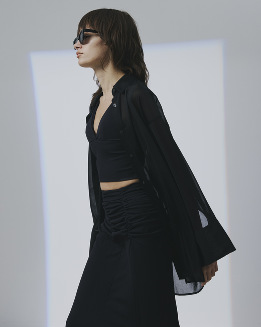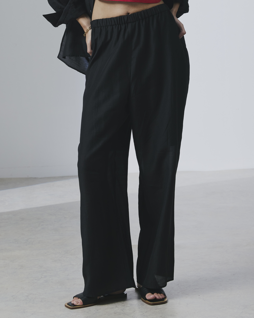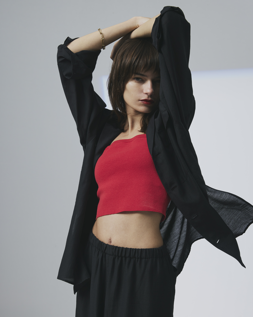 夏を楽しむブラックとして最も取り入れたいのが「透け」。着ていないと思うほど軽い素材に、大人な透け感。シルク混で肌触りが良く、暑い夏を快適に過ごせる万能なセットアップです。インナーに赤を効かせてスパイスアップしたスタイルを提案。