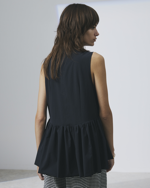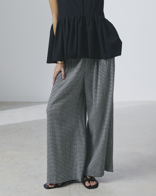 360度どこから見てもシルエットが美しいペプラムブラウス。裾を袋状にしたことでボリューム感が増し、前後差を付けて甘さを控えめにしました。モノトーンのギンガムは大人の女性でも取り入れやすく、カットソー素材のパンツに合わせることで、脱コンサバでスタイリングが楽しめます。