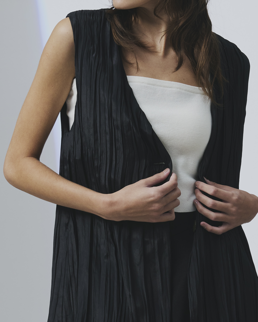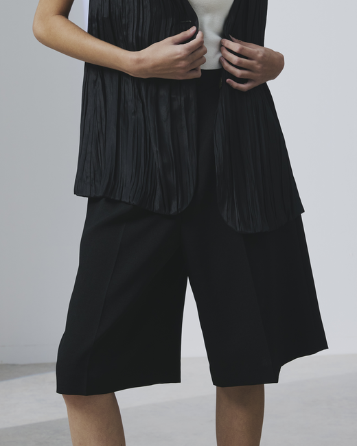 1枚持っていると夏のスタイリングがグッと広がるジレ。構築的なプリーツが、ブラックコーデに新しい輪郭を持たせてくれる。整った印象をベースにしながら、バミューダパンツで軽やかにくずす。まじめすぎない、そのバランスが今のブラック。