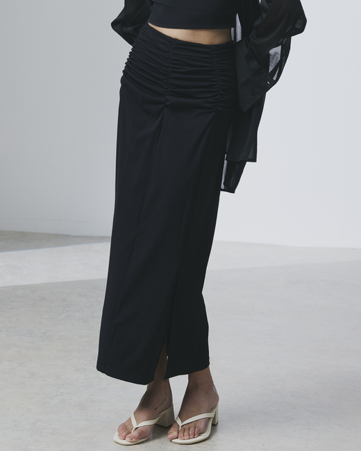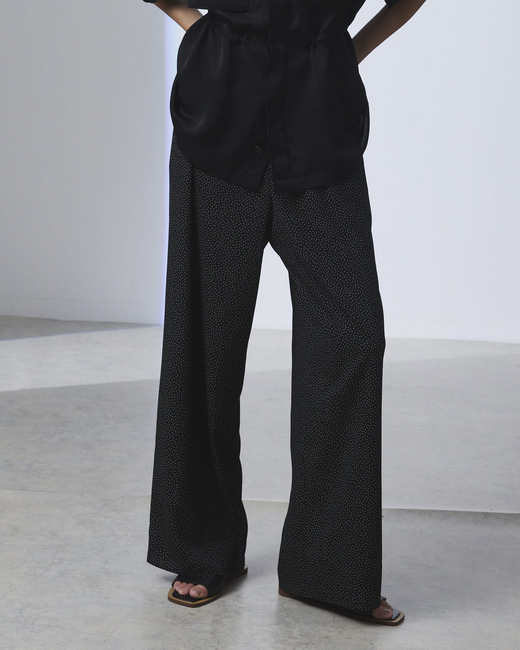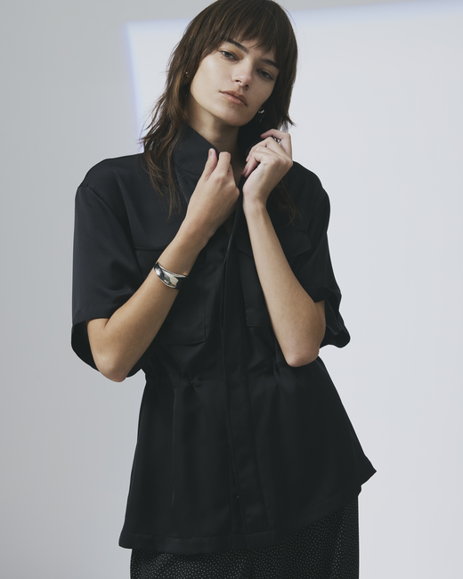 光を多方向に反射してとろみを併せ持つサテン素材は、どこか瑞々しく軽やかさを演出してくれます。イージーなウエストゴムのパンツは、ミリタリー要素のあるシャツとメリハリの効いたスタイリングに。ウエストのドロスト紐を絞ってペプラムのように女性らしいシルエットも楽しめます◎