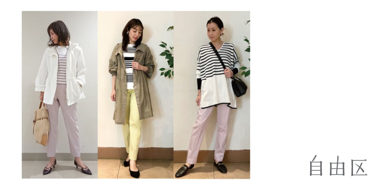 カタチの良さに定評のある自由区のセンプレパンツは、色遊びを楽しめる余裕が。