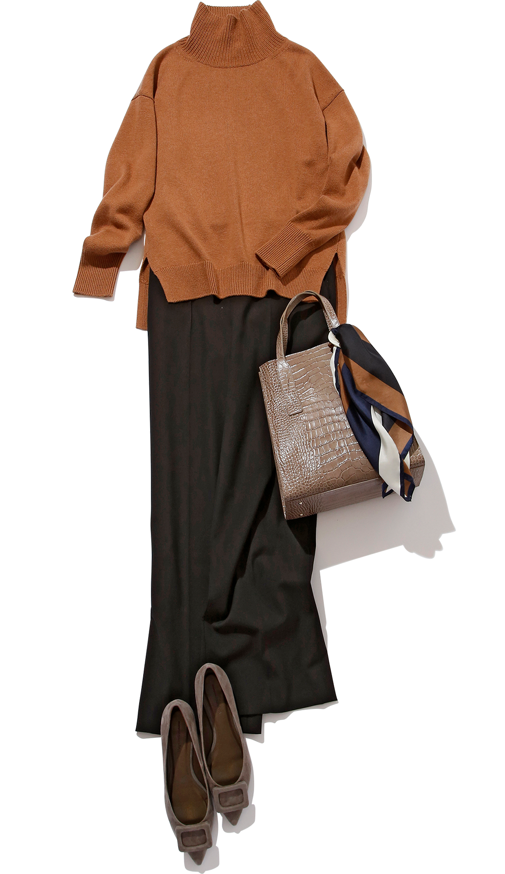 • 大人のモノトーンスタイルに茶系小物でハズせば今どき感も。