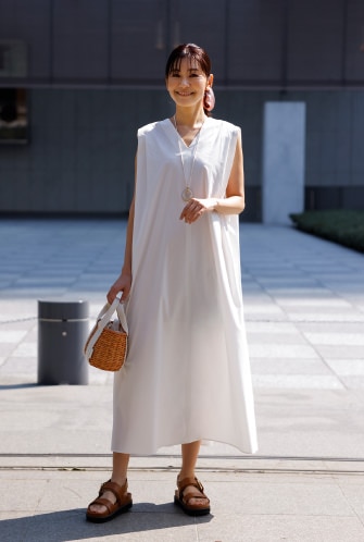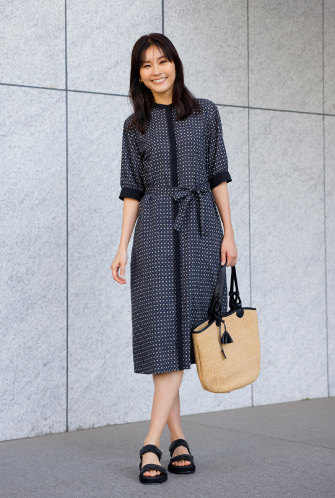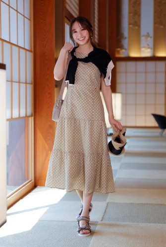 甘くなりすぎるティアードデザインも、細やかなギャザーの入り方でAラインをきれいに作り、長めのレングスにして落ち着いた印象に。凹凸感のあるサッカー素材は、さらりとした肌触りで初夏向けのワンピース。ドット柄も落ち着いた配色で大人。