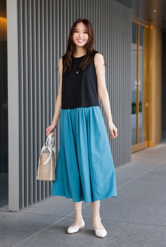 大胆なカラーブロックも大人こそ着こなしたいモダンなワンピ。ボディラインを拾わないリラックスしたシルエットながら、メリハリのある印象になるのは配色のおかげ。スカート部分は撥水加工を施してあるので汚れにくく、手洗いも可能だから清潔感もキープ。