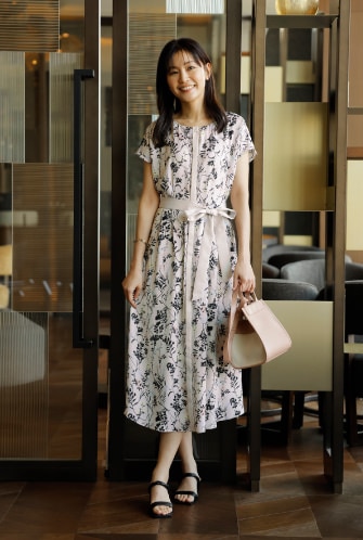 サテンジョーゼットのとろみある素材感に描かれたボタニカルプリント柄。特別なホテルステイの日にはこんな格好で楽しみたいご褒美ワンピース。美しく着るために、フロント部分の裾近くは開かないような工夫があり、着るだけで所作も美しくなる一着。