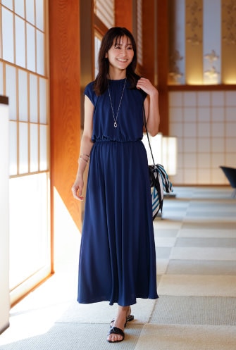 初夏の空に映える、印象的なインクブルー!細やかなギャザーが美しくドレーピーなジャージドレスは、バックスタイルがアクセントになったシンプルなのに華やかな一品。ウエストのゴムでブラウジングをして、身長にぴったりな丈に調整して。