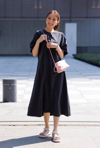 着こなすのが難しい柄ワンピは、小さい柄を選んで大勝利。シックな色の「小紋柄」は柄の主張が控えめで無地感覚で使えて、バランスに左右されず小柄さん~高身長さんまで似合いやすいからチャレンジしてみて。ネイビーのフロントラインのおかげで縦長効果も期待できます。