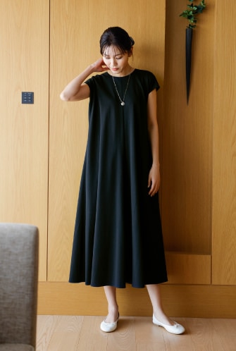 旅行の最終日など、心地よさも求めたい日におすすめの一着。着れば現れる美しいフレアライン。ピケ素材にジャージー加工を施して、品を感じる光沢感があり、シックな色が一層映える。肩を見せすぎない袖できちんとした場にも馴染めるワンピースです。