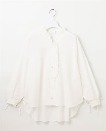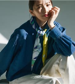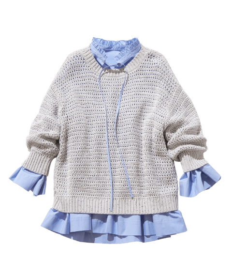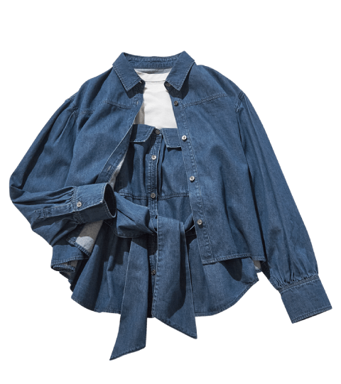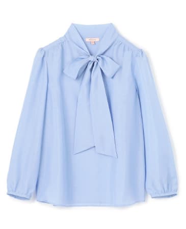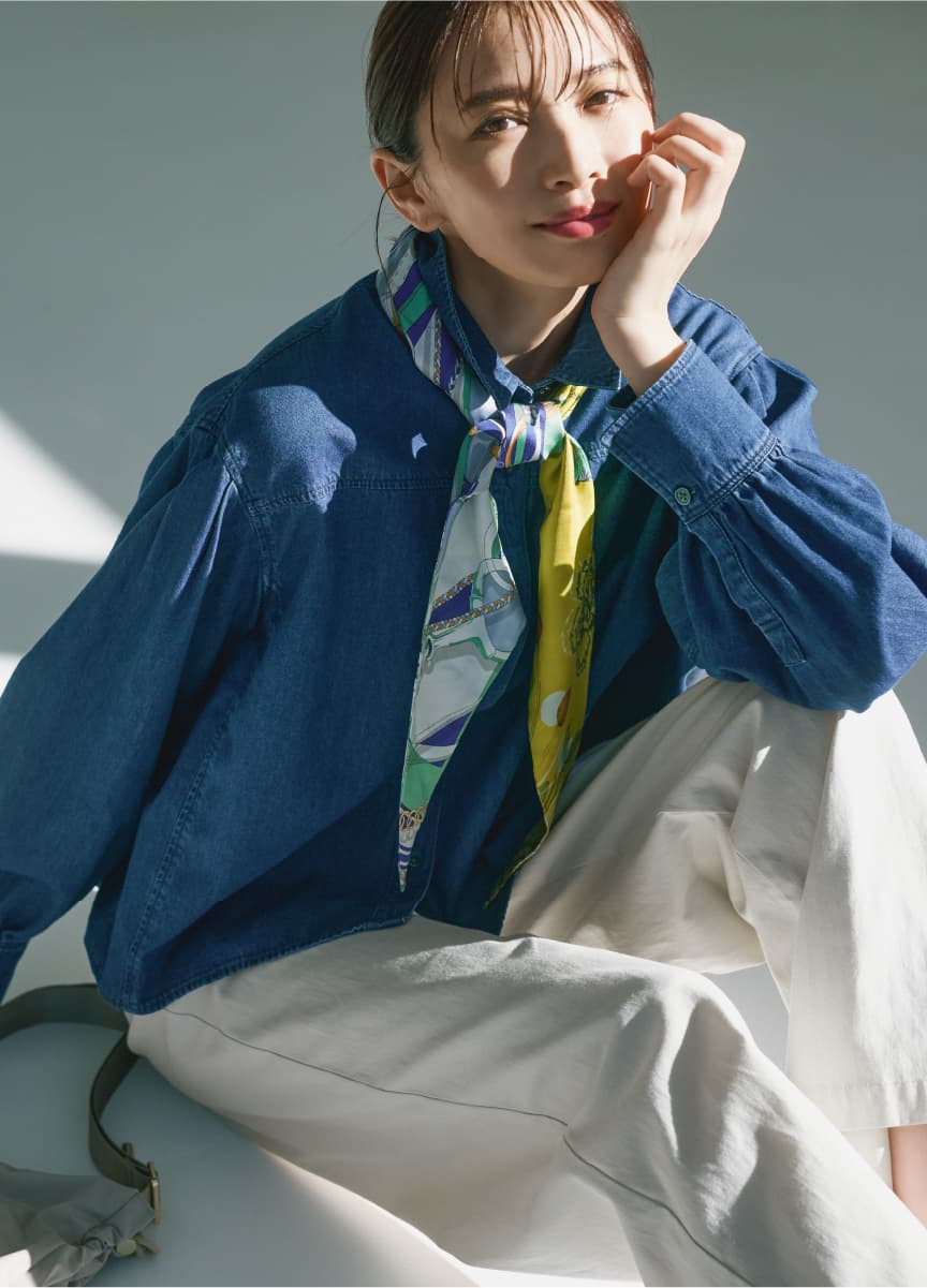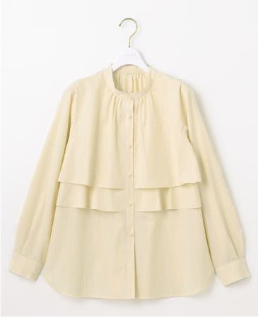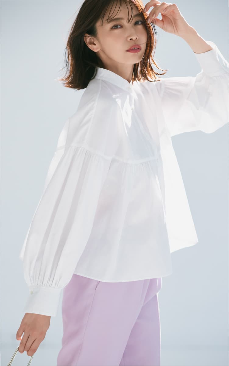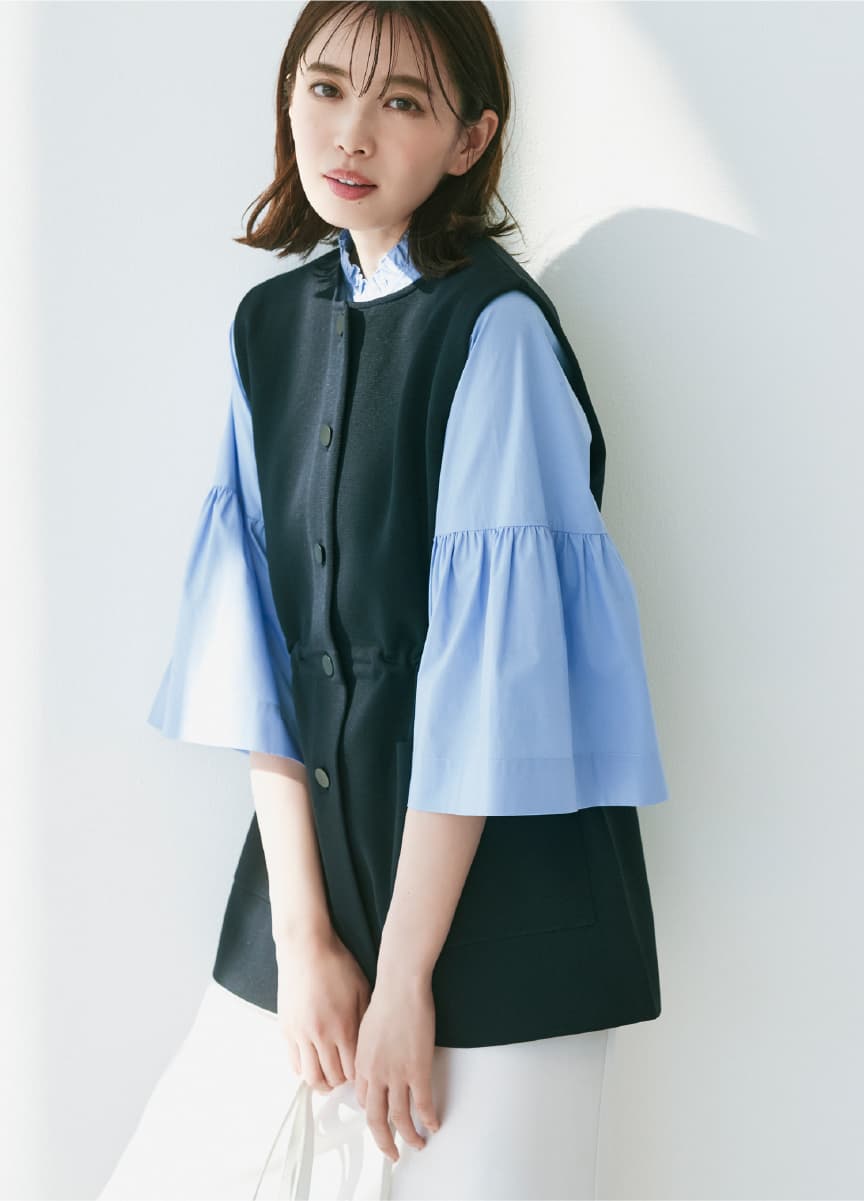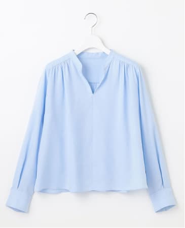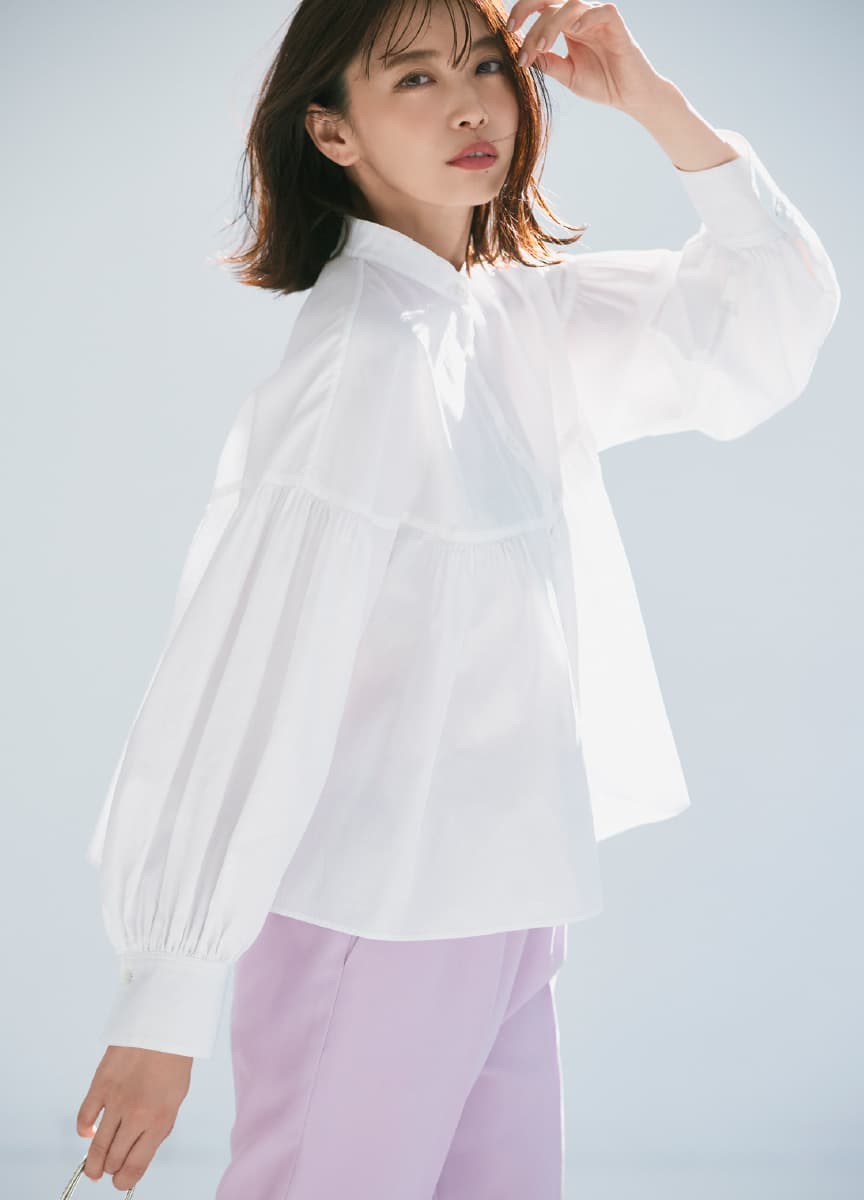 フリルネックと切替えギャザーに可愛げを託したシャツは、カジュアルにもモードにも振れるデザイン。爽やかなブルーで顔まわりも華やぐし、1枚でも重ねてもサマになるから、この春絶対手放せない。
