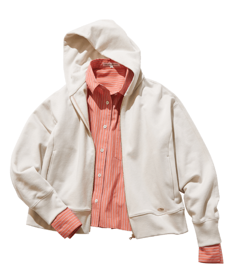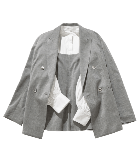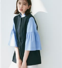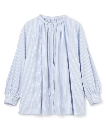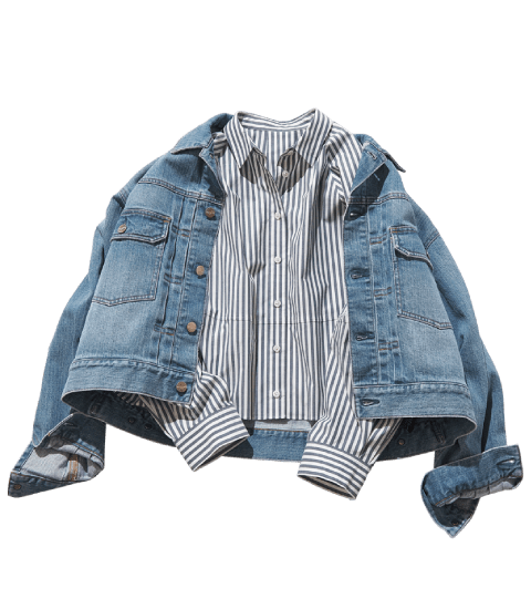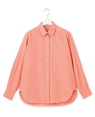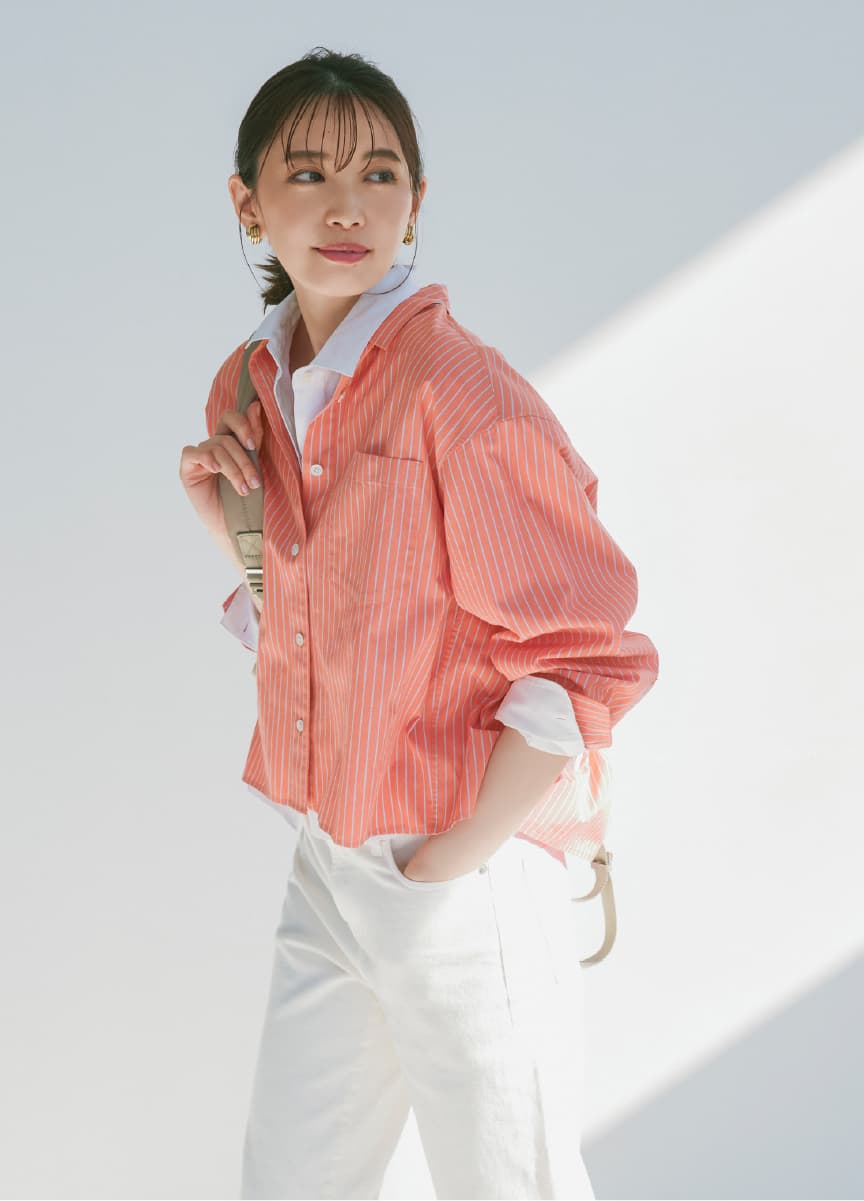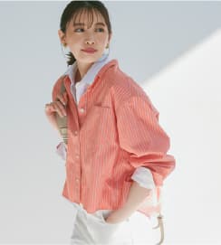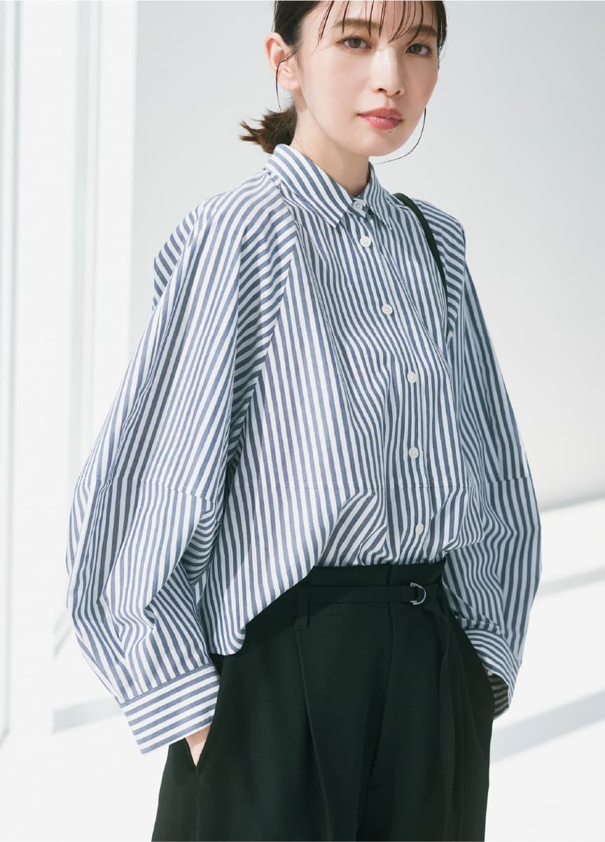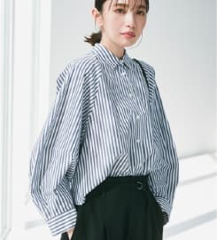 ベーシックなシャツディテールを今っぽく着るならこちら。ショート丈に加え、ゆとりのあるサイズ感が大人にマッチ。ふっくらとした袖口と、顔映りのよいキレイなストライプもドストライク♡マンネリコーデの回避に、シャツの重ね着もあり。