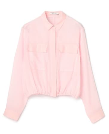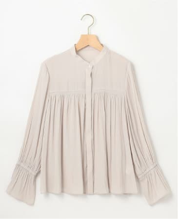 ボリュームのある袖と胸元のギャザーのふんわり感で、シャツの単調さを払拭!短丈でトレンドは押さえつつも、程よい肉感と光沢感のある上品な素材で、おのずとカジュアルすぎないルックスに。