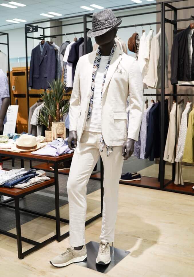 サマーセットアップはホワイトで。白い砂浜をイメージしたカラーに、モノトーンの柄をアクセントに。more ›JOSEPH ABBOUD -
