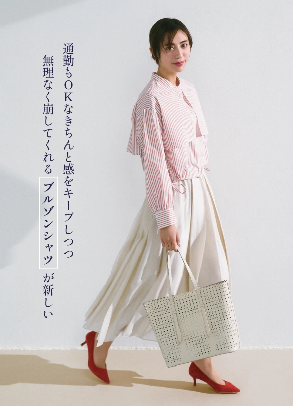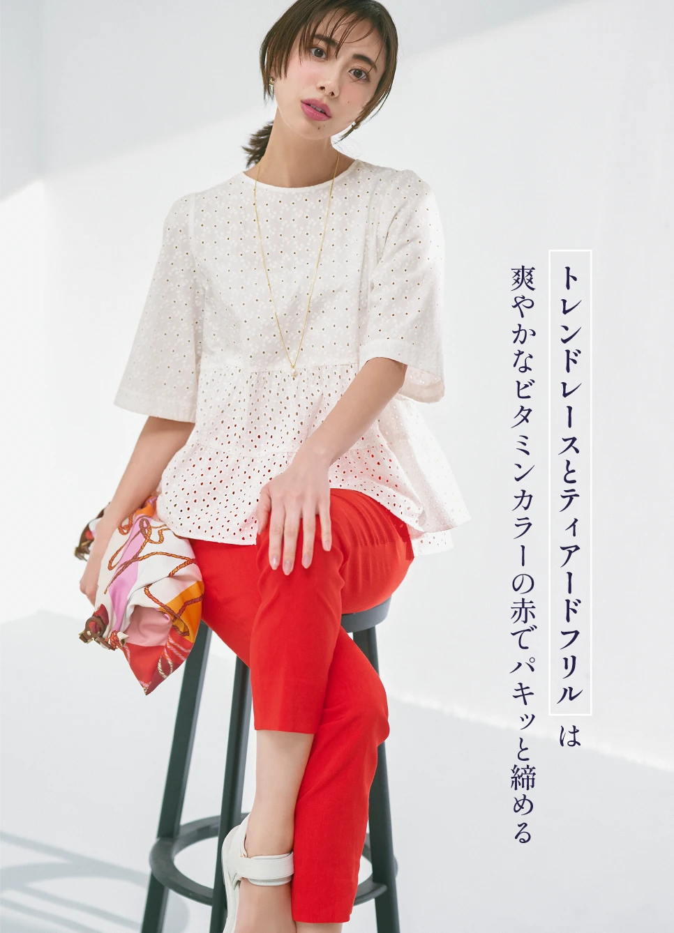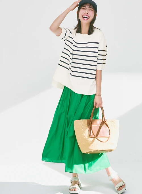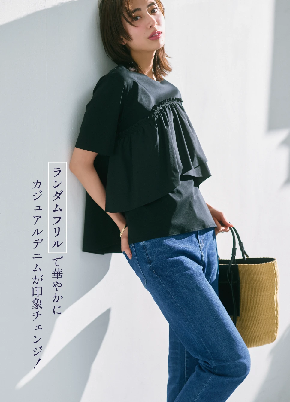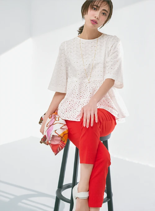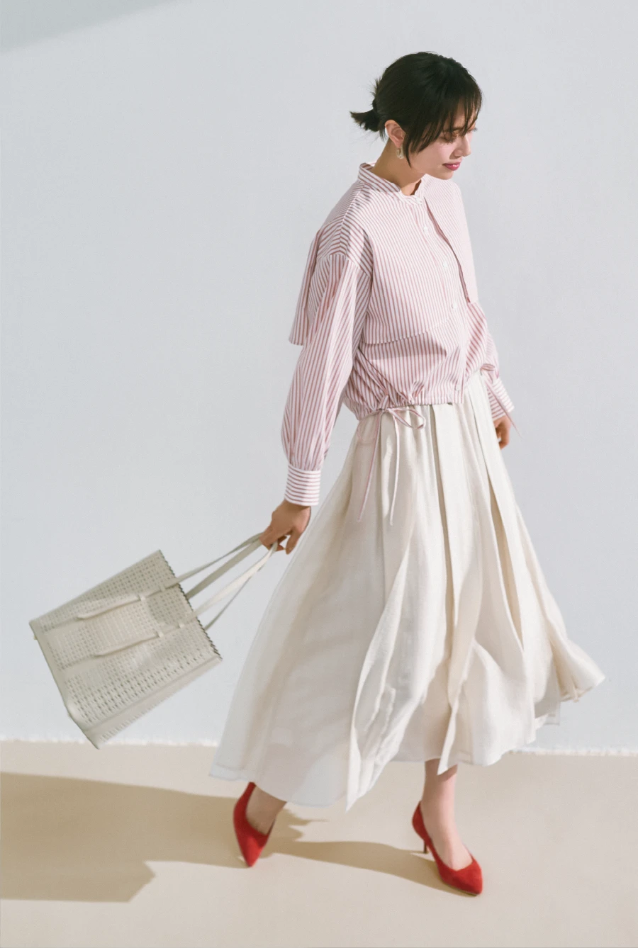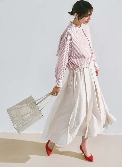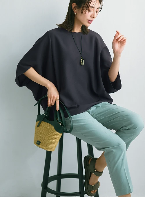 - 気になるお腹周りをオシャレに隠す!ややハイウエストだからスタイルアップ見え。