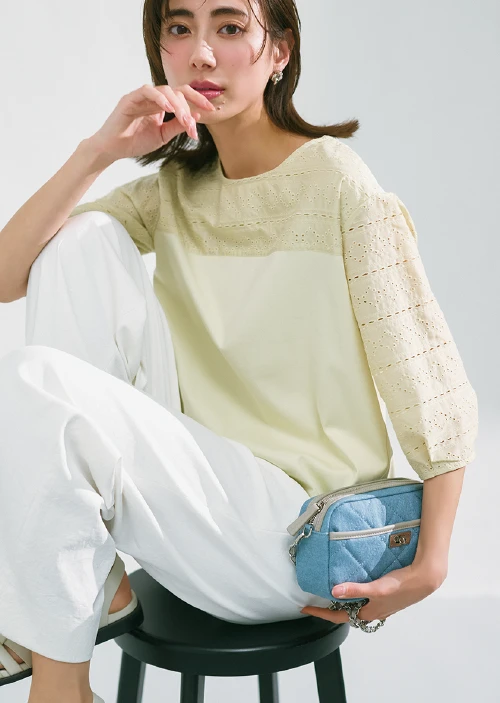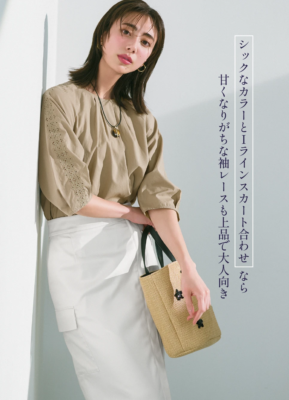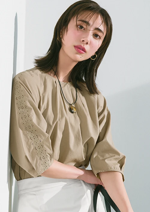 - 立体感のあるパフスリーブにレース調刺繍が目立ちすぎずに華やか。
