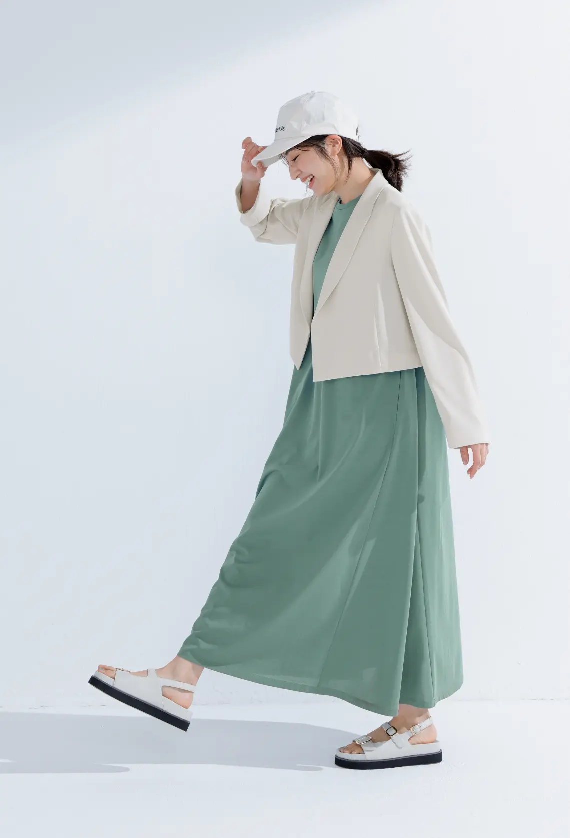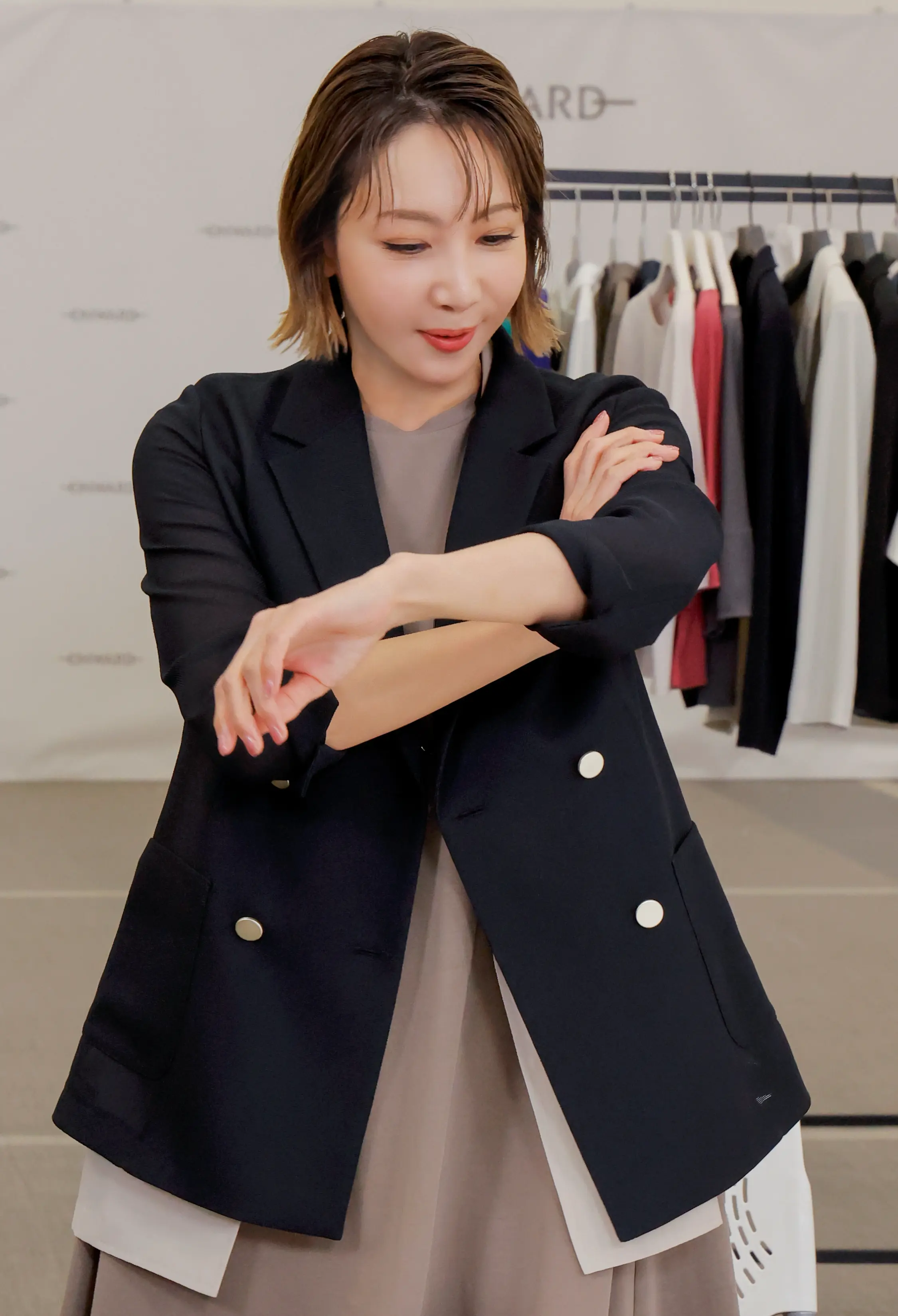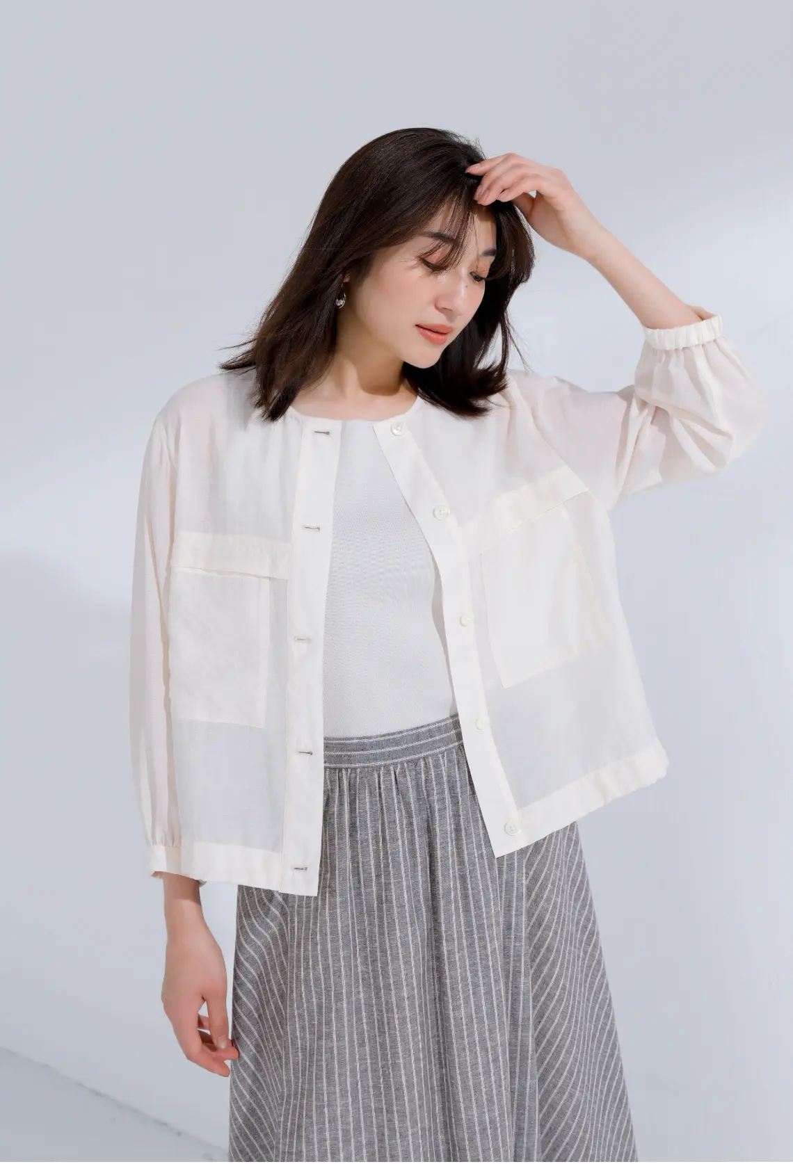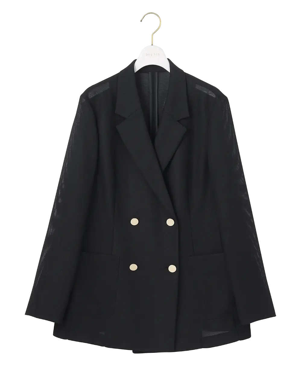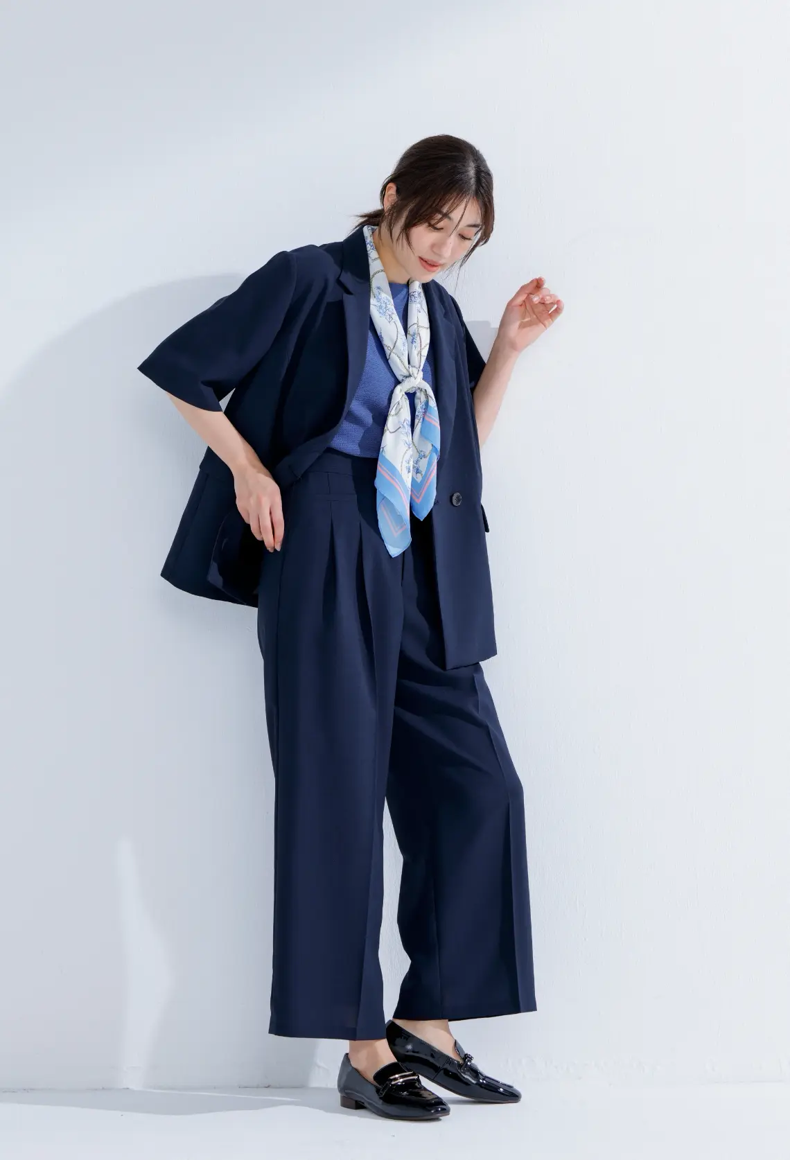 洗えて吸水速乾性もあるシアーなジャケットは、ゴールドボタンが大人っぽさを演出。洗練されたワントーンの着こなしに、ニットで色差しすれば、夏らしいハッピーなムードに!
