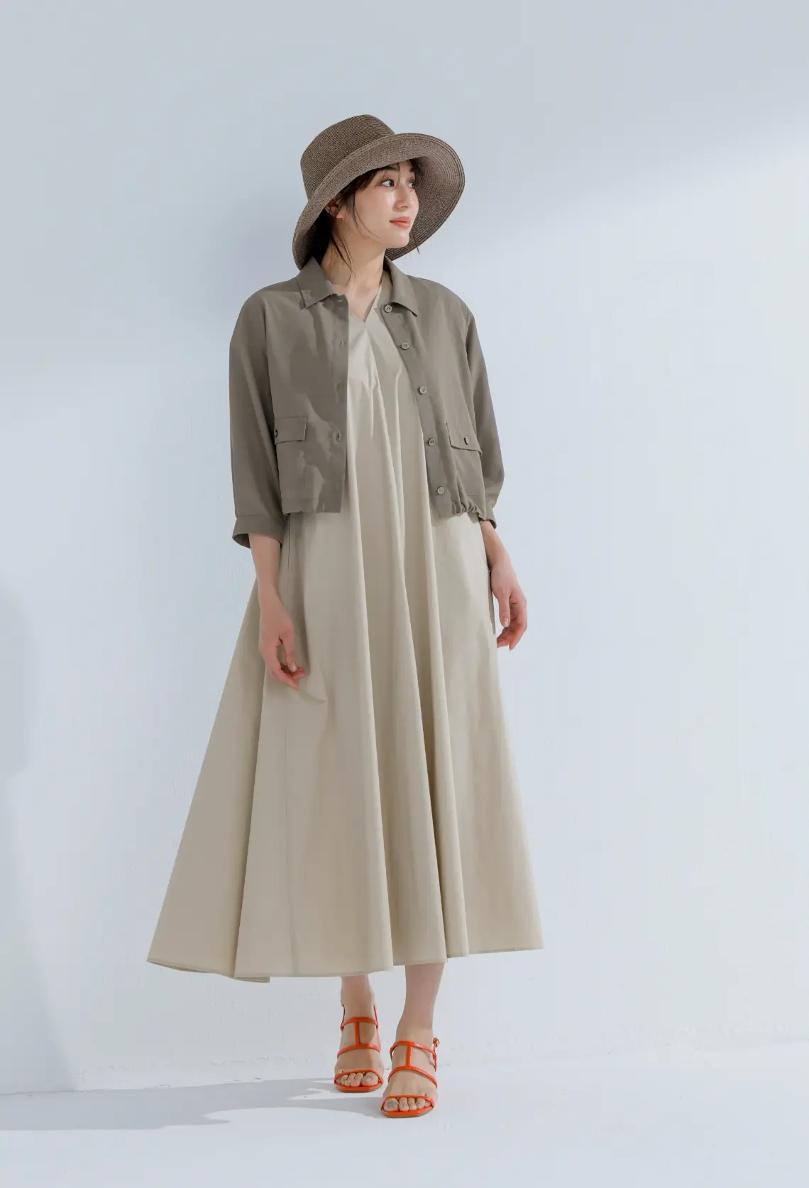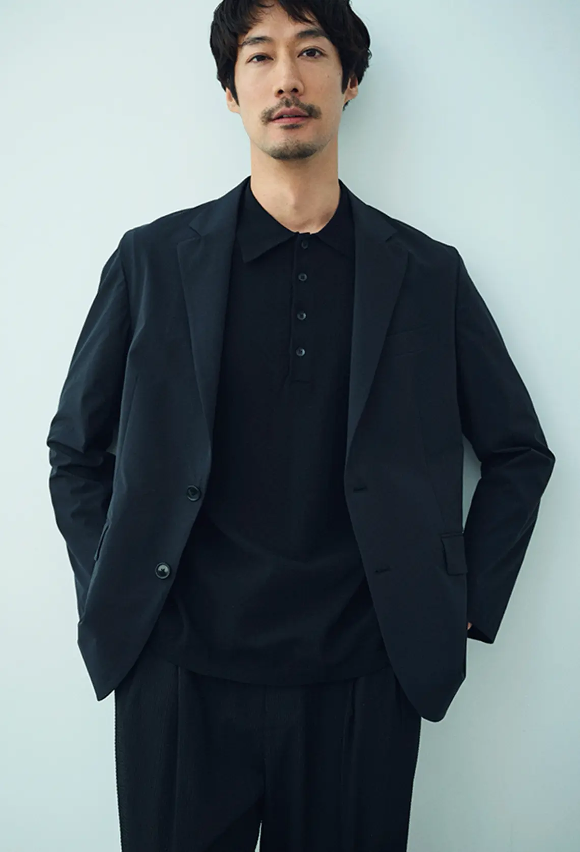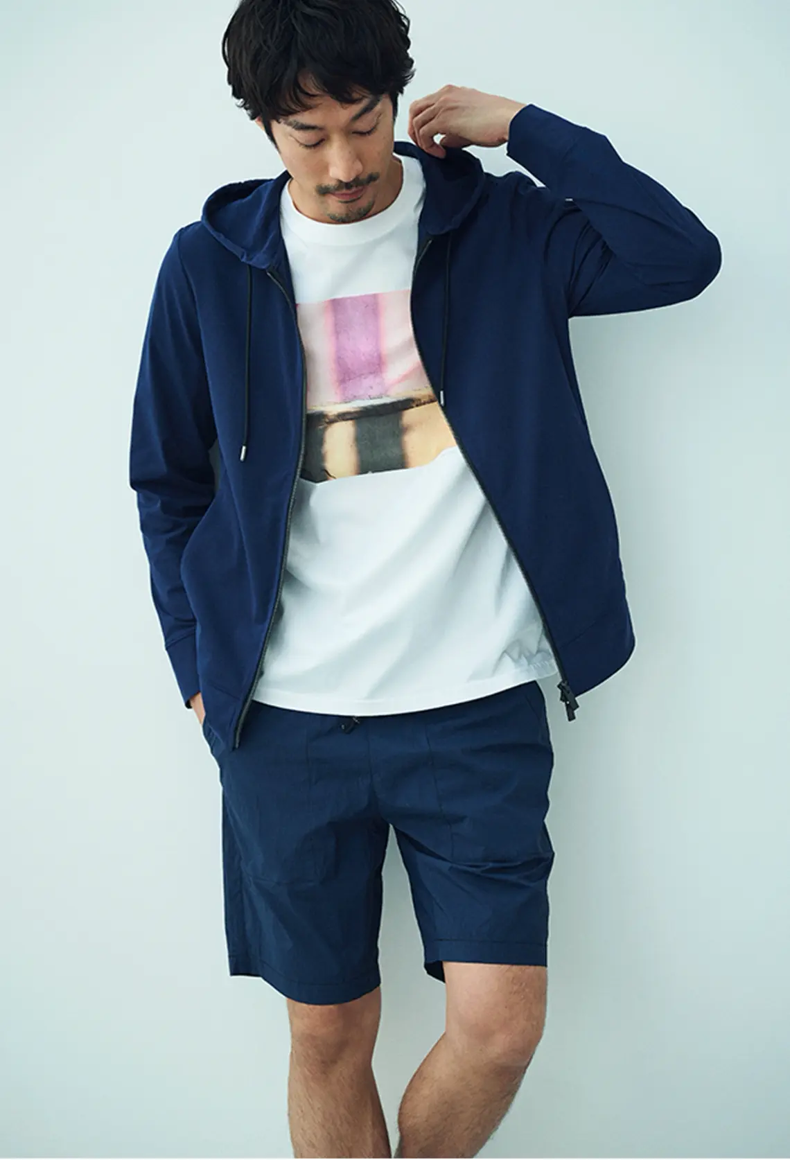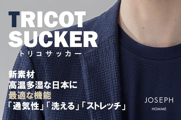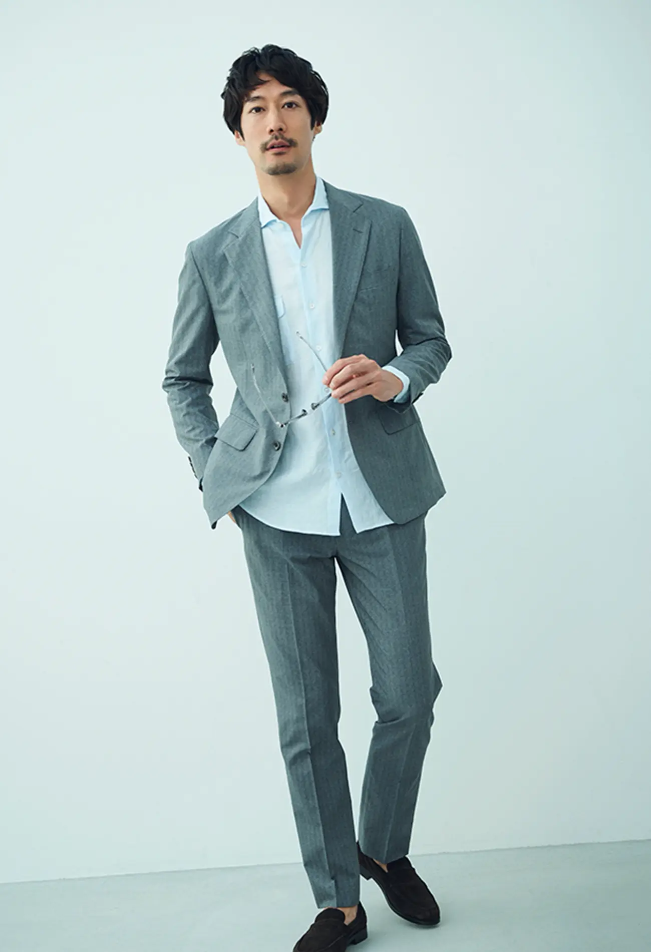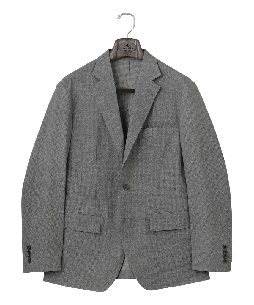 通気性抜群の一枚仕立てのセットアップは、よく見るとヘリンボーンプリント。防シワ、はっ水、接触冷感、UVケア、ウォッシャブルなど機能が満載。美しい立体シルエットも魅力。
