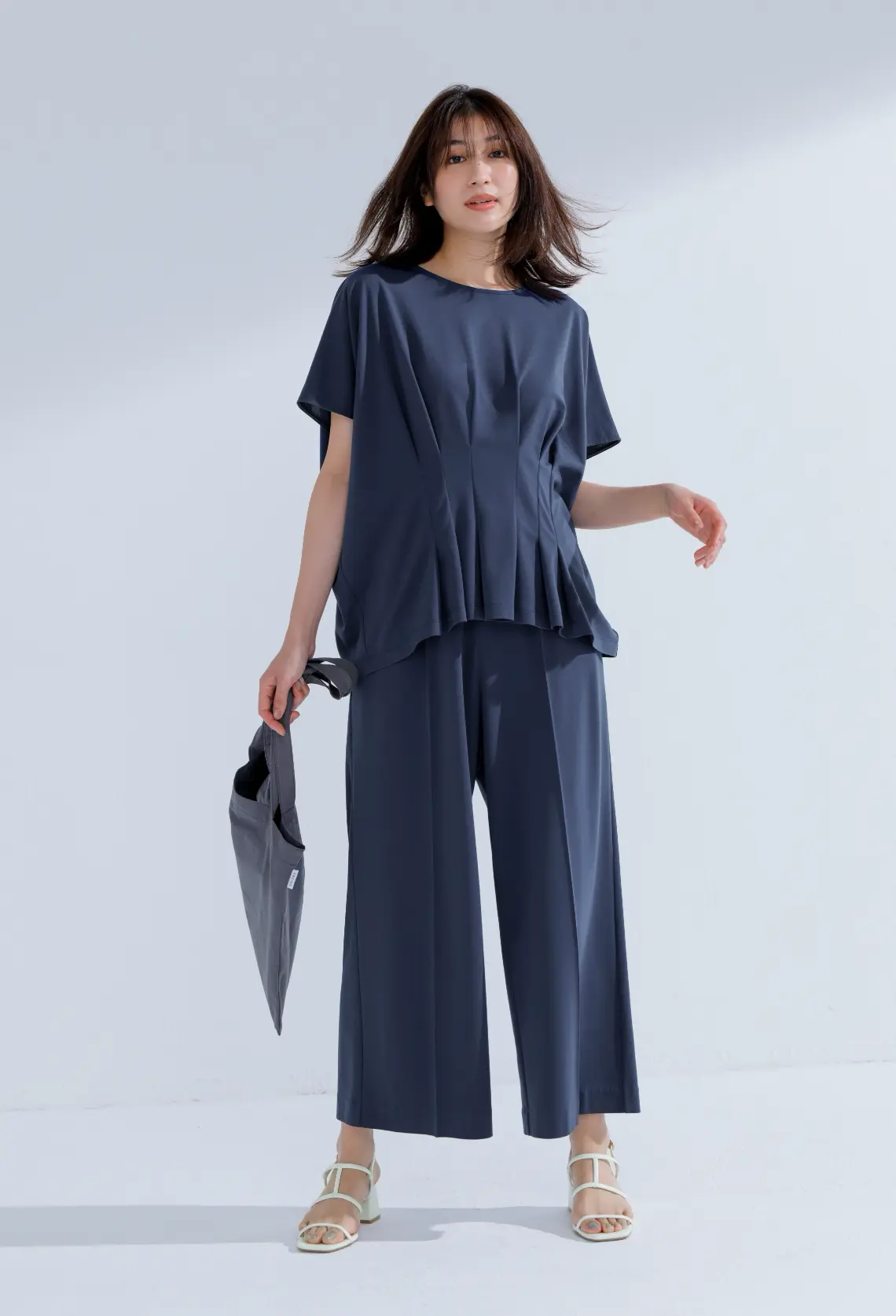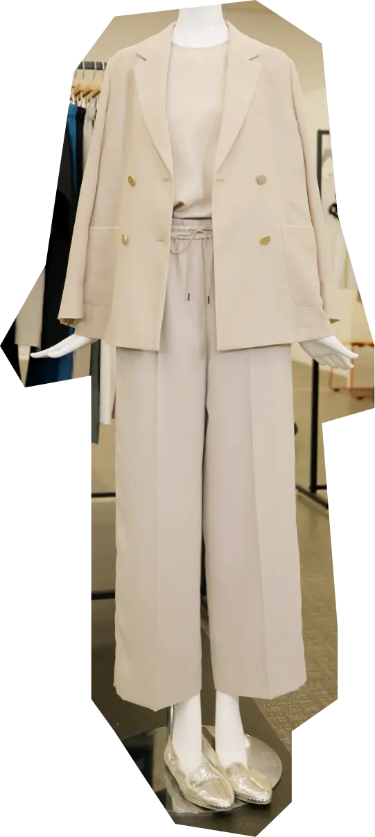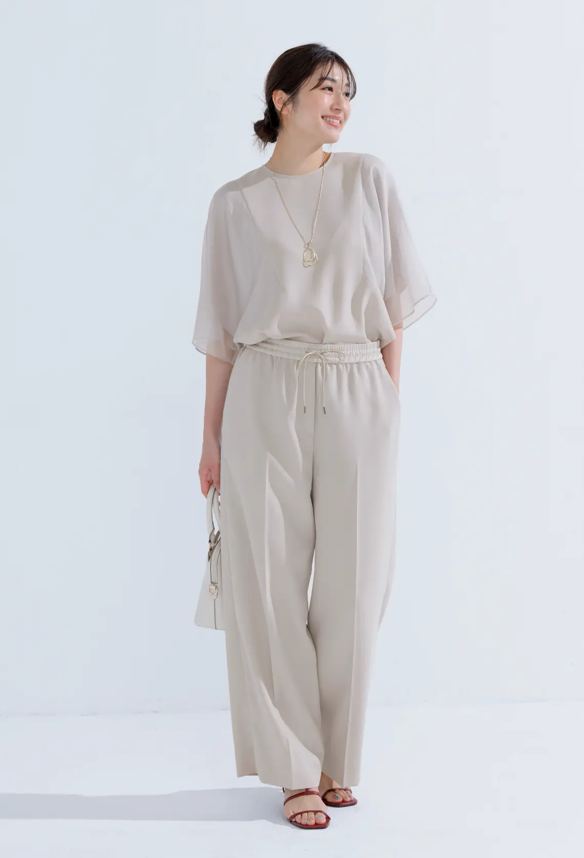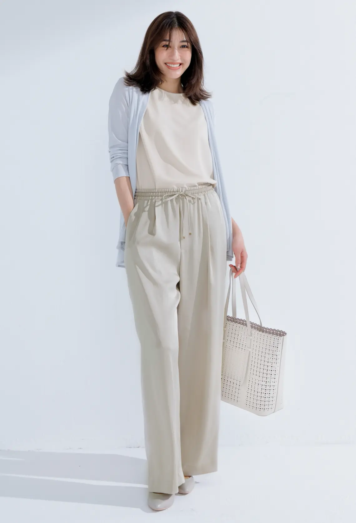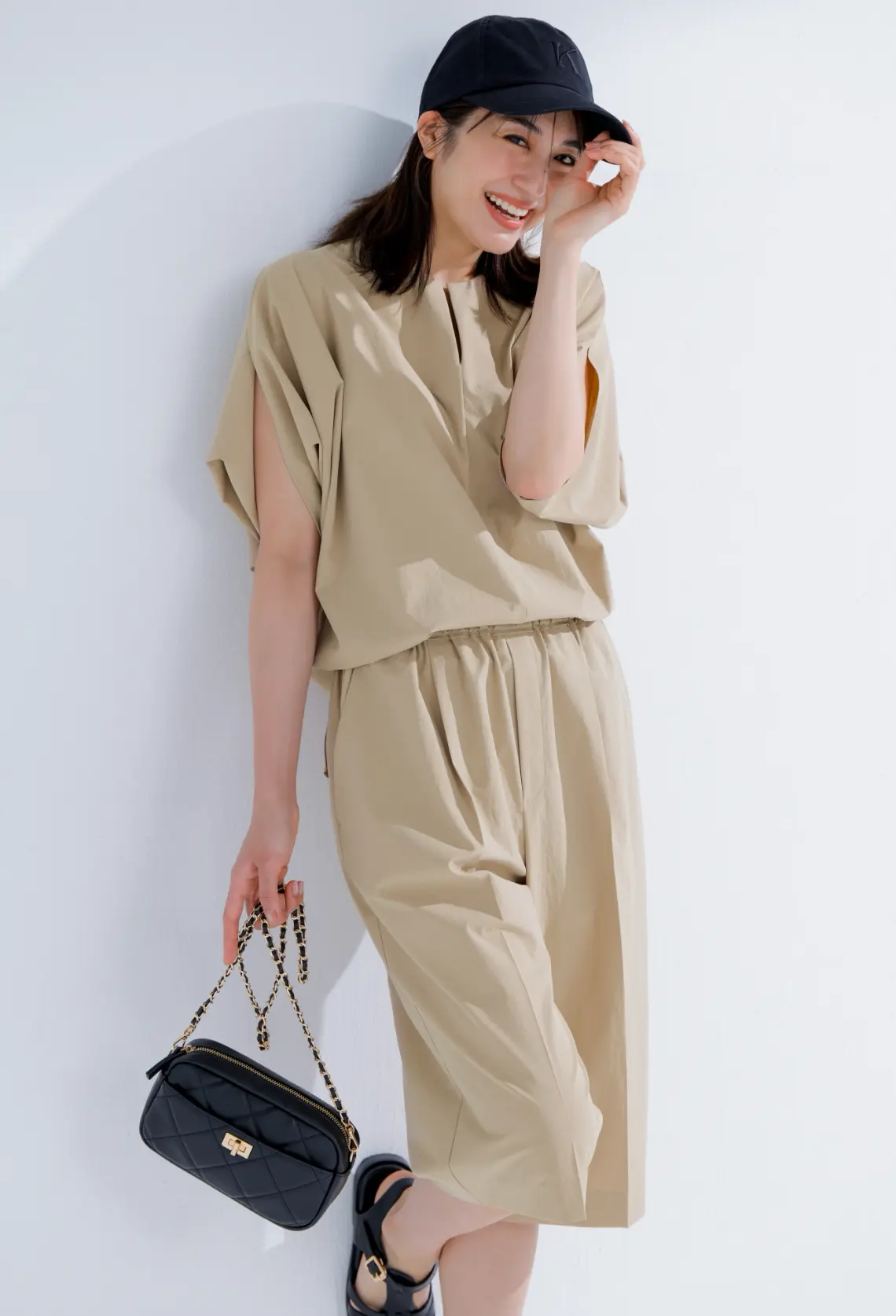 きちんと感を意識したパンツセットアップで、ワントーンにスイッチ!オールベージュは、色の濃淡でぼんやり感を回避。汗じみや汚れを気にしなくていい、黒じゃない色の涼しい服で、梅雨オシャレが楽しくなりそう!