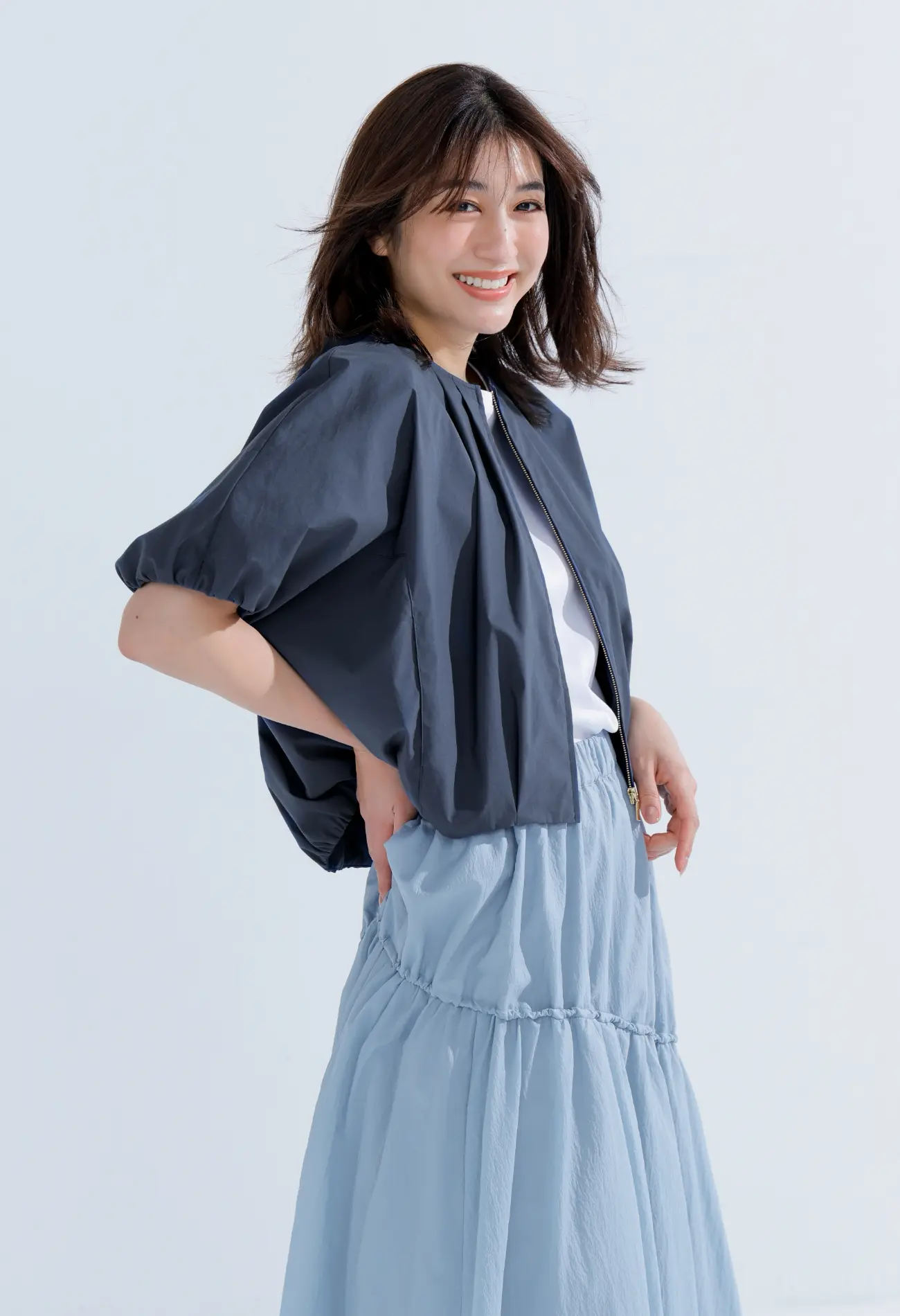 雨の日に便利なはっ水ブルゾン×はっ水スカートを、暗い気分にならないよう爽やかにまとめたブルーコーデ。歩くと暑くなるので、接触冷感機能が役立ってくれる。