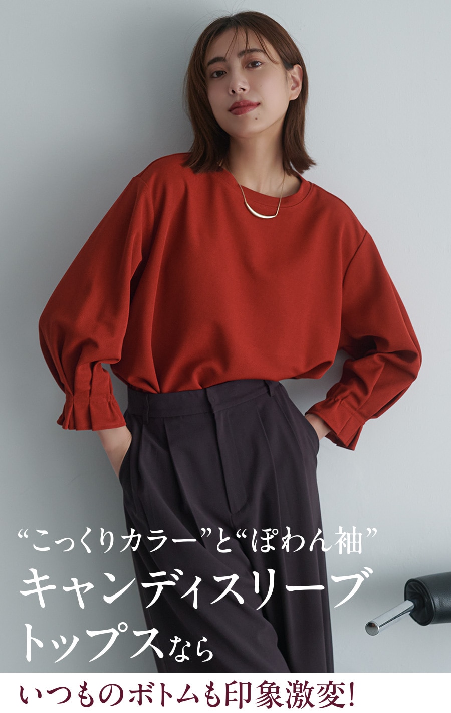 ハンサムなワイドパンツも、フレア袖のトップスならかっこよくなりすぎずに好バランス。お仕事スタイルにもすんなり馴染みつつ映える、頼れる1枚。思わず手に取るシワになりにくいイージーケアも魅力。