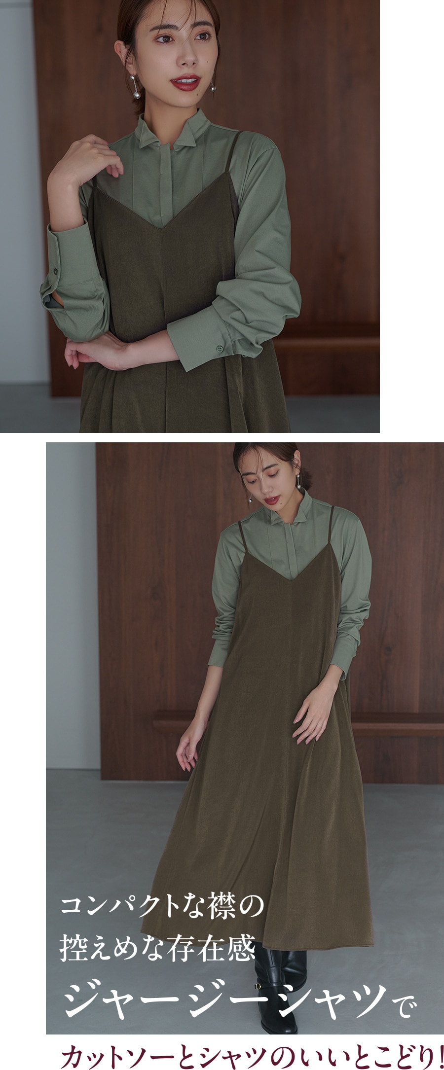 フロントのボタンを隠した前立てですっきりとしたきちんと感を叶える。ジャケットインでも1枚でもOKな程よいフィット感で、重ねてもごわつかない使い勝手の良さも。深みのあるグリーン系のワントーングラデーションの着こなしが今っぽい!