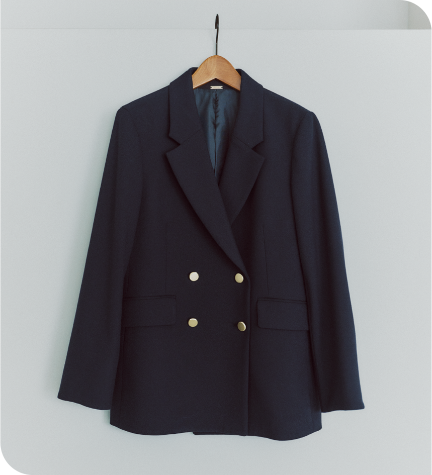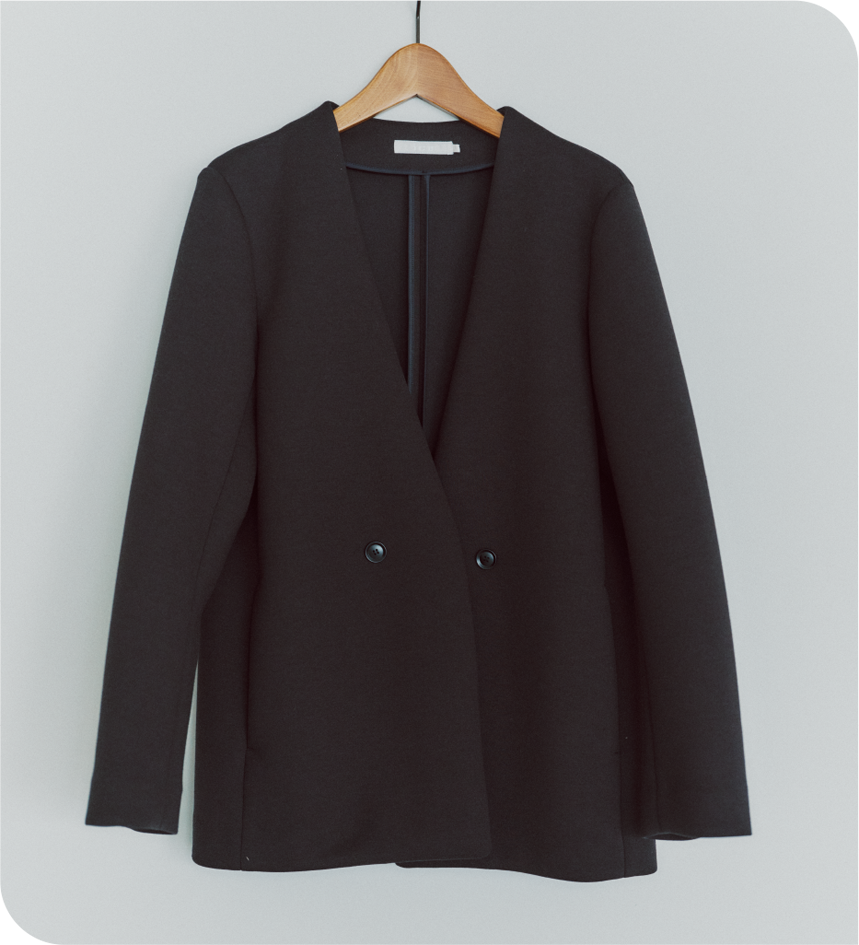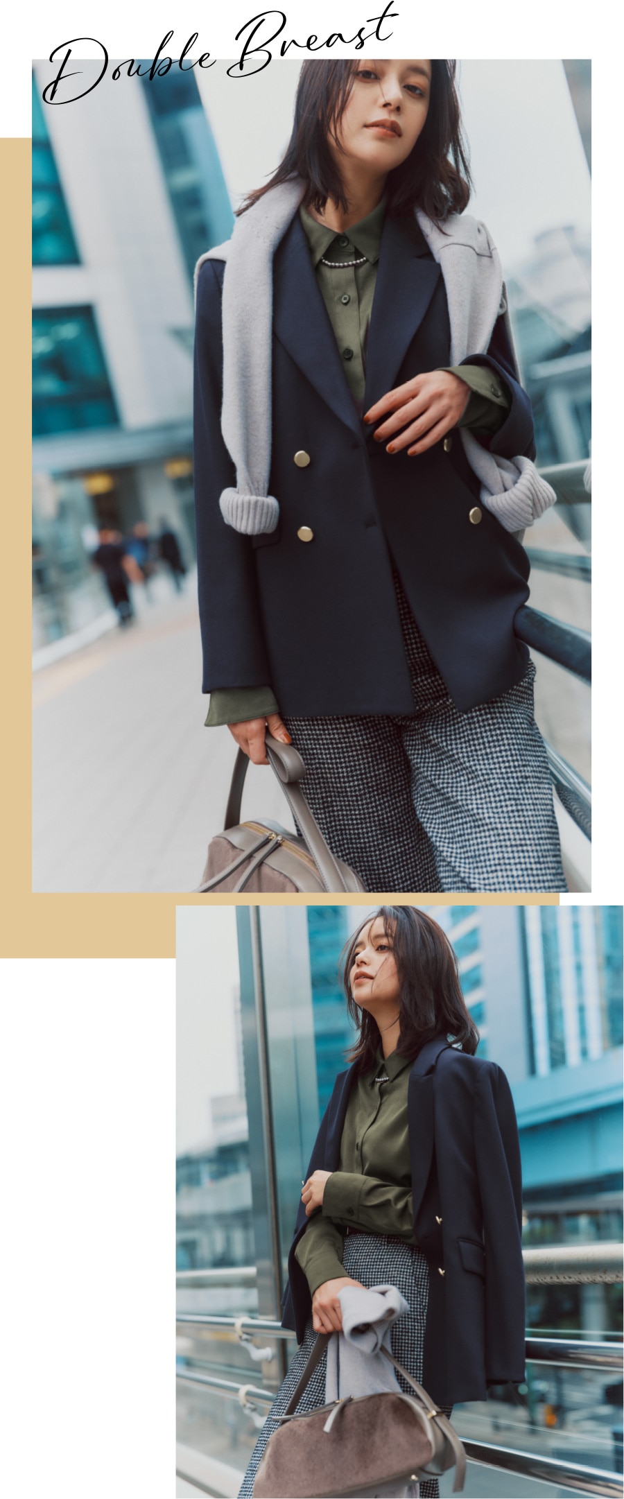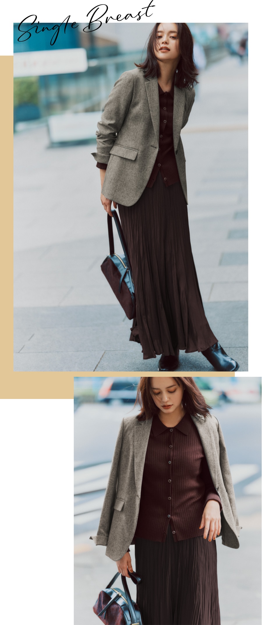 正統派のシングルブレストだからこそ、袖をまくってみたり、カーデのように肩掛けしてみたり、大胆にアレンジしても“お仕事感”はキープ。無地とも柄ともつかないメランジ調の色合いを活かして、同系色のグラデーションコーデを楽しんで。