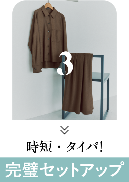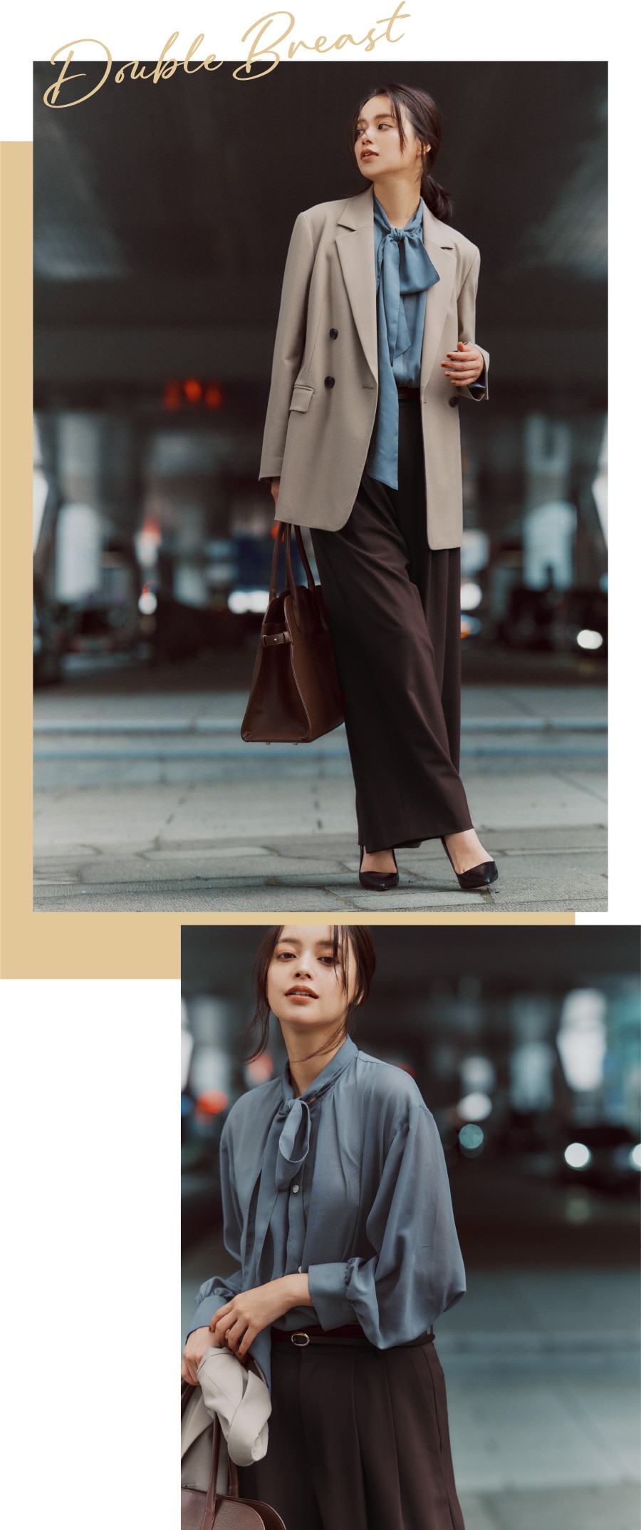 きちんと感を保ちながら今年顔にしたいなら、選ぶべきはモカベージュ。シアーブラウスの抜け感やブラウンのワイドパンツが、端正なジャケットスタイルをソフトに仕上げる。自宅で洗えてイージーケアだから、ヘビロテだってOK!