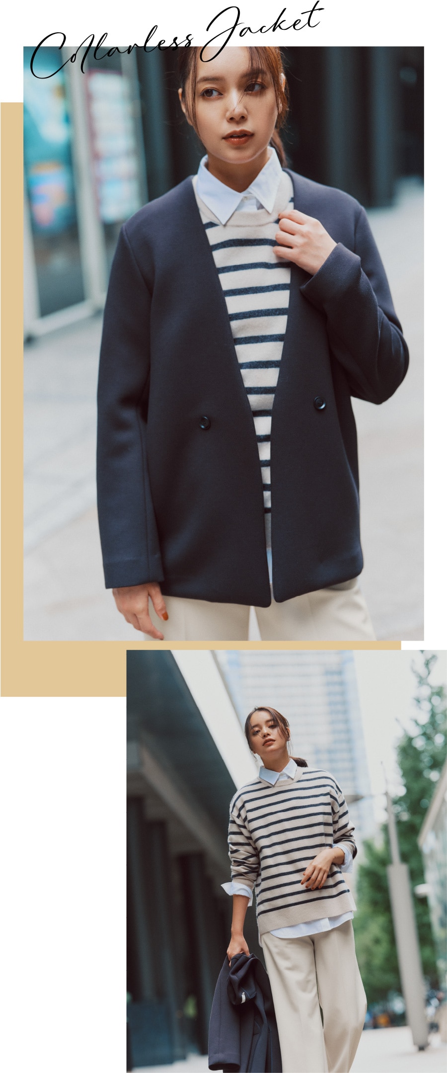 スポンディッシュな素材を活かした、見た目も着心地もリラクシーなノーカラージャケット。極力ディティールをそぎ落としているから、深Vネックを活かしてレイヤードを楽しめる。ボーダーもお仕事コーデのアクセントに。