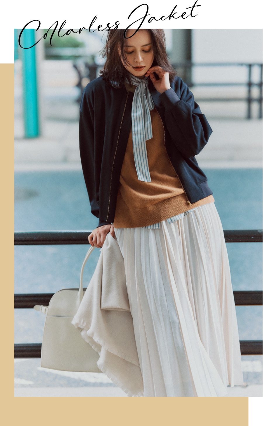 プリーツスカートとボウタイブラウスの甘さを、ほっこりさせず程よくモードに仕上げる、ノーカラーの黒ブルゾン。普段着以上だけど堅苦しくない。羽織るだけで、即お仕事モードに昇華する。