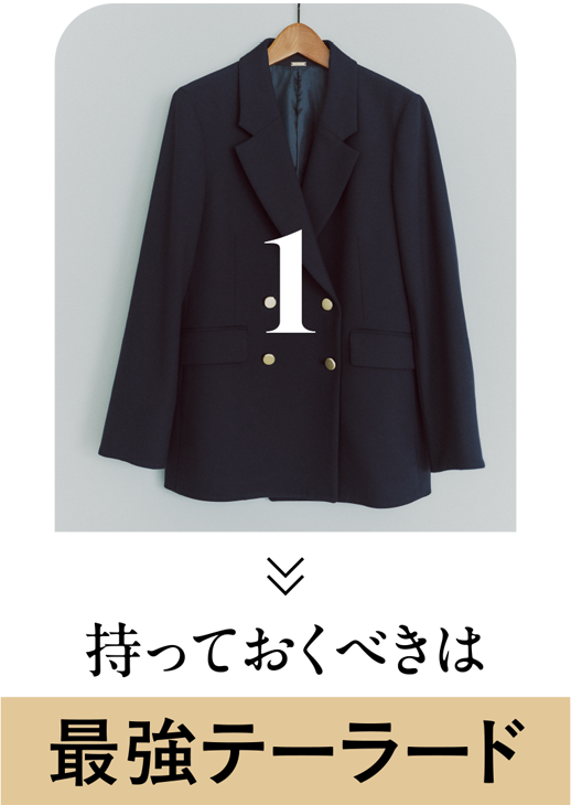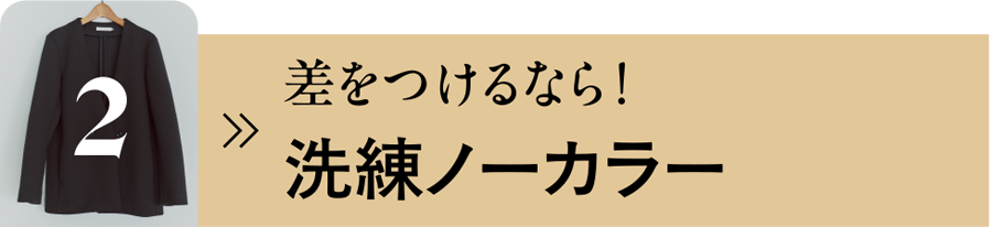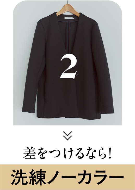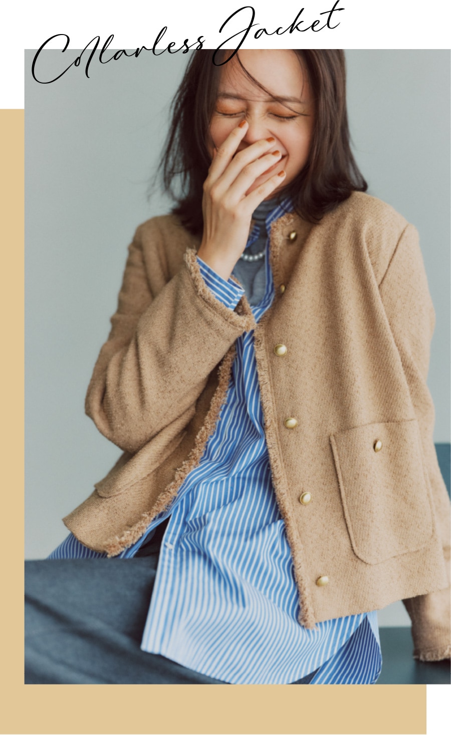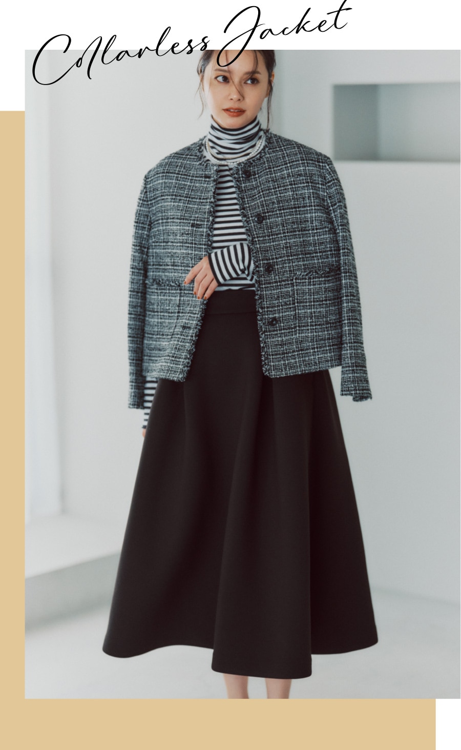 ノーカラー×金ボタンのコンビネーションが、“きちんと&華やか”がマストの大人事情を完璧に叶えてくれる。短めの丈を活かして、インナーの裾はアウトに。クラシカルなデザインだからこそ許される、程よいリラクシーの取り入れ方。