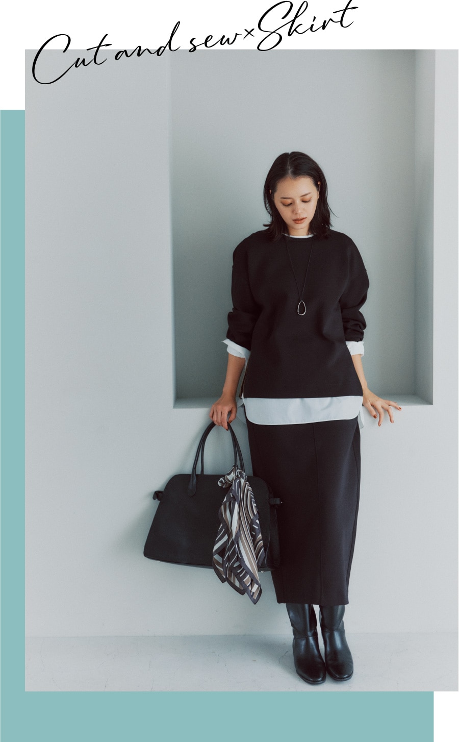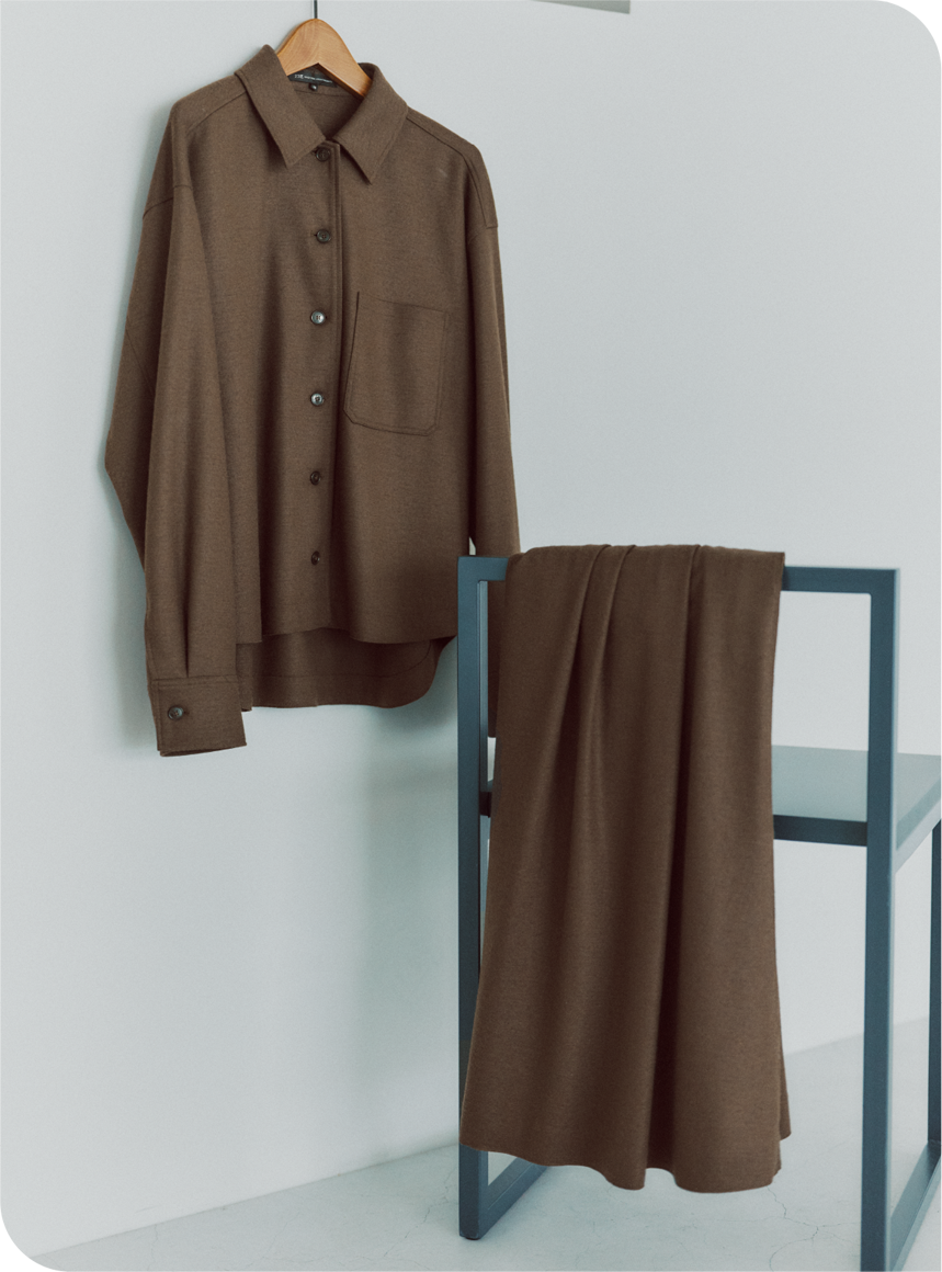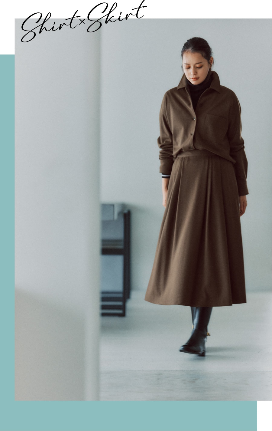 羽織って着てもサマになるウールシャツを、前後差のある裾を活かしてフロントIN。ウエストマークだからこそ、優雅に広がるフレアスカートが引き立つ。トレンドのブラウンとロングブーツが似合う、“ただ便利”の枠を超えたこだわりスタイルに。