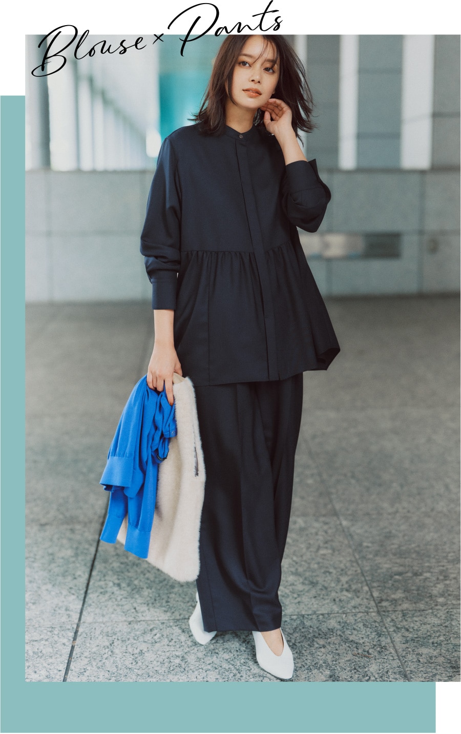 イレギュラーに揺れる裾が表情豊かな、デザインブラウスとパンツのセットアップ。知的で端正な印象のネイビーだからこそ、小物は優しいホワイト系でまとめ、抜け感をプラス。パールのアクセサリーをプラスすれば、オケージョンまで見据えられる完璧セット。