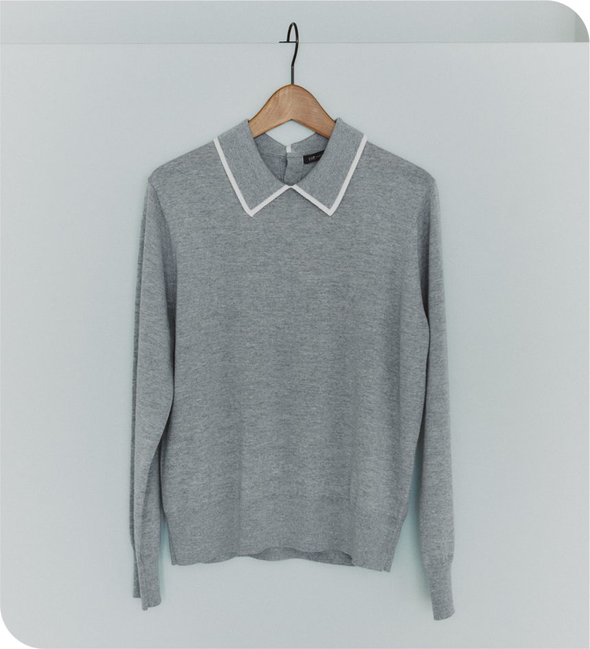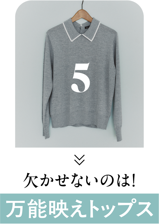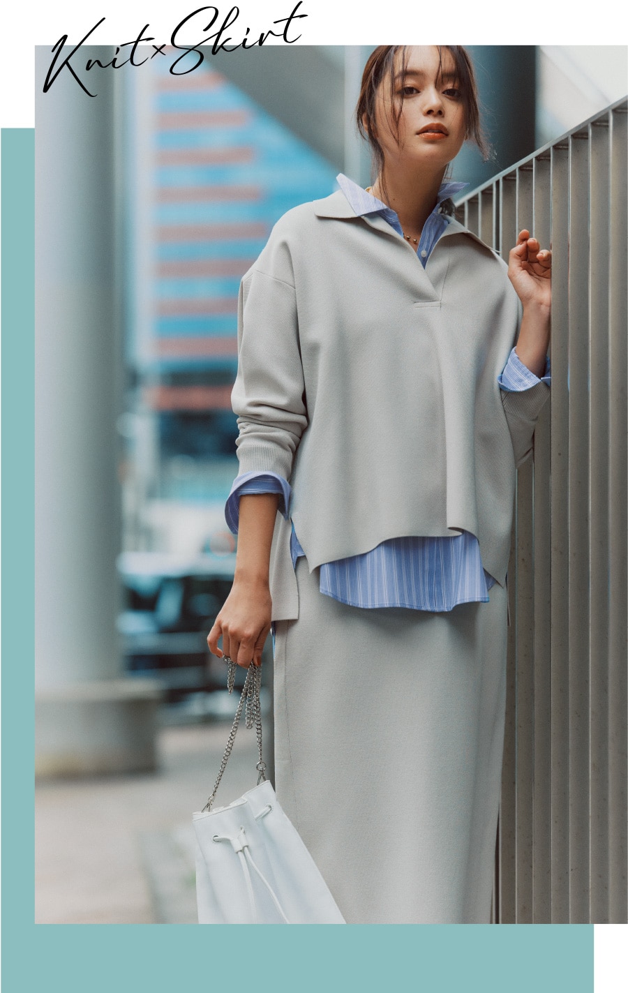 トレンドの襟付きニットも、シャツレイヤードでお仕事モードにブラッシュアップ。デコルテ部分が開放的なデザインは、1枚で女っぽくも着られるけれど、トレンド意識の襟on襟のシャツコーデがオススメ。