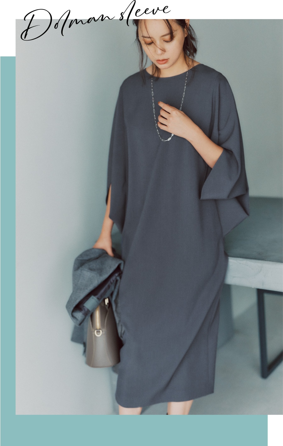 たっぷりとした分量の布を優雅にまとっているような、ドルマンスリーブワンピース。スタイルアップのポイントは、落ち感が生む美しく揺れるドレープ。しぐさの一つ一つに品が宿る1着に出会えたなら、自然と自信もわいてくるかも。