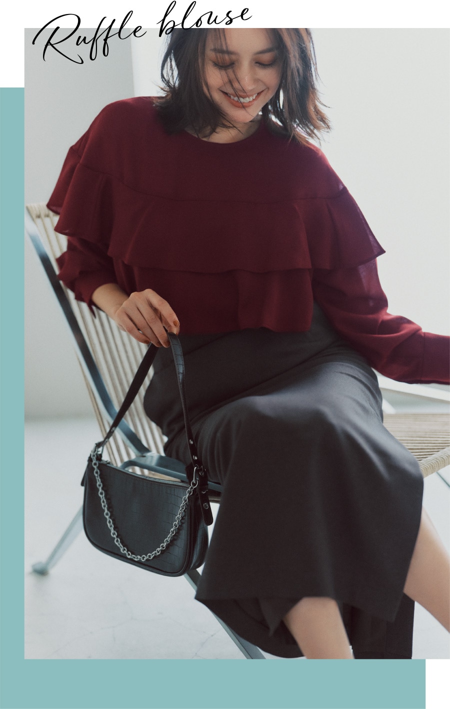 重なるティアードフリルでエレガント見えする、ほんのりシアーな甘映えブラウス。こっくりとしたボルドーカラーを選べば、季節感も上手に取り入れられる。Iラインスカートとパンプスで、ちょっと気取れる華アリ通勤服に。