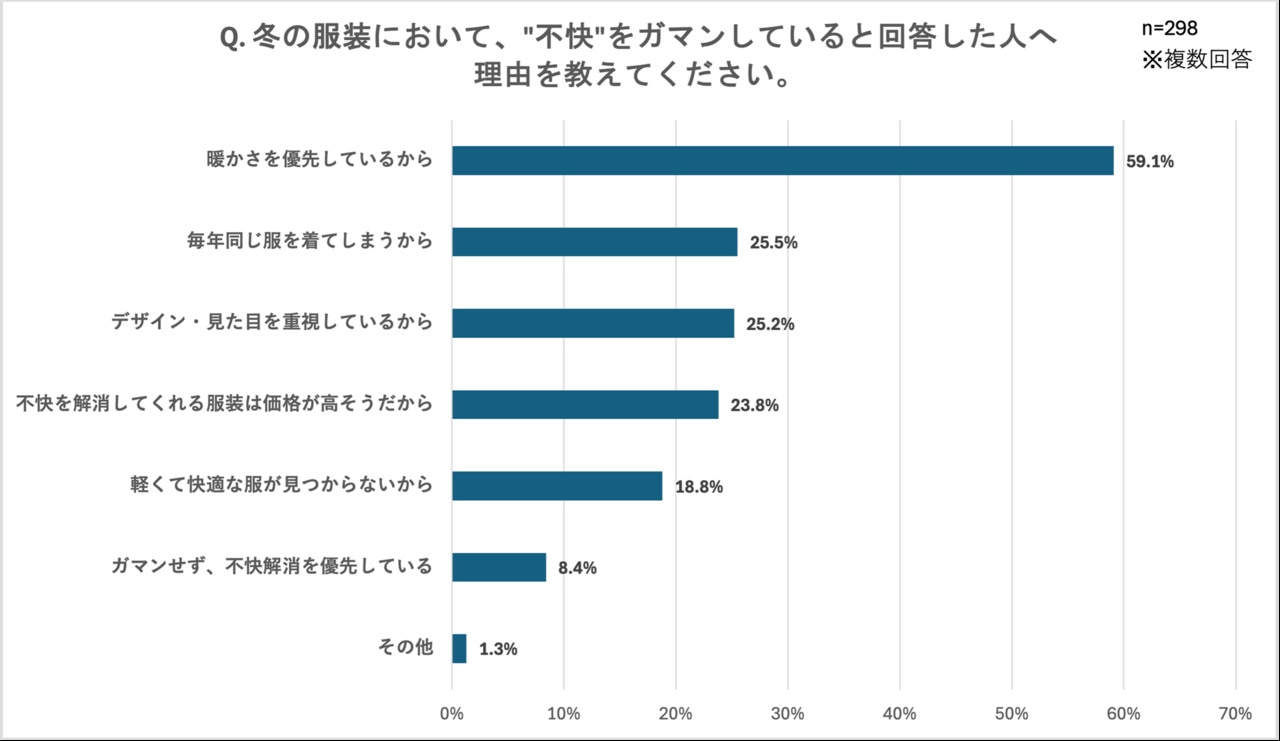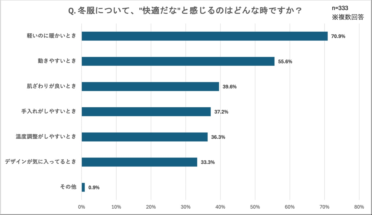 ここまで、冬の服装において不快さを感じているものの防寒も欠かせない、といった声が多いことが明らかになりましたが、さらに「"不快"をガマンしている理由を教えてください。」という設問には、「暖かさを優先しているから(59.1%)」が最多となりました。また、「冬服について、"快適だな"と感じるのはどんな時ですか?」という設問では、「軽いのに暖かい時(70.9%)」が最多となり、これらの結果から、冬服選びにおける「暖かさ」と「快適さ」という、一見ジレンマの関係にある両立を求める声が強く浮き彫りになりました。