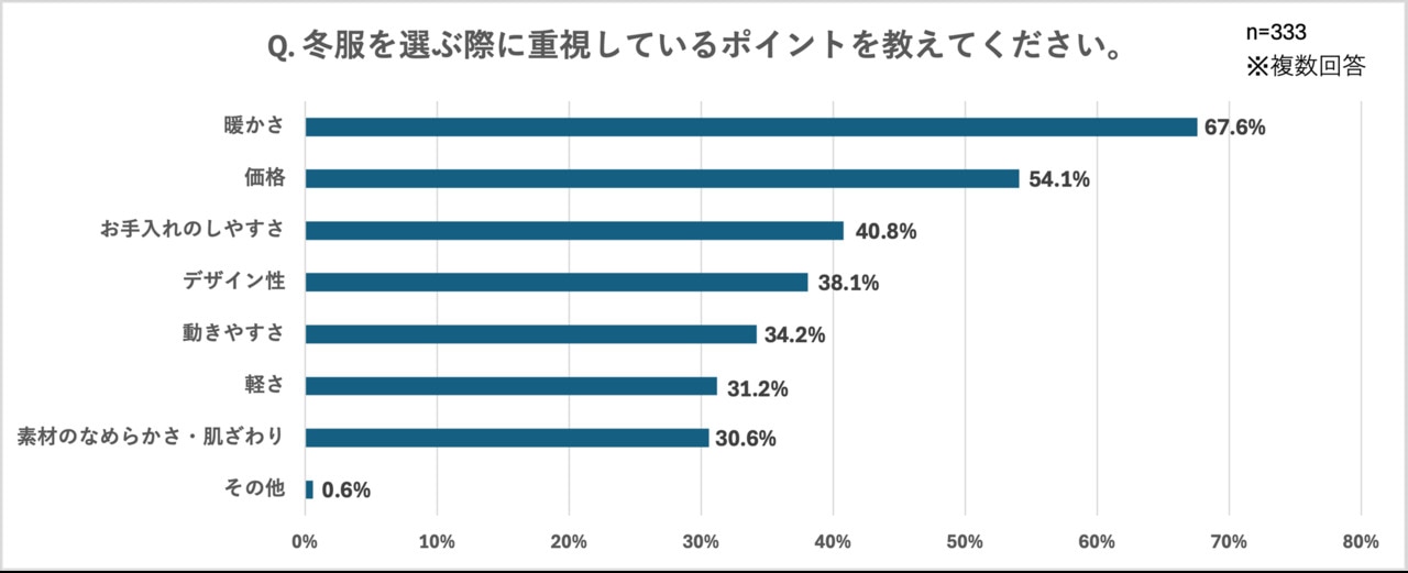 「冬服を選ぶ際に重視しているポイントを教えてください。」という設問には、「暖かさ(67.6%)」が最多となり、防寒を一番の目的とした服選びに需要があることがわかりました。