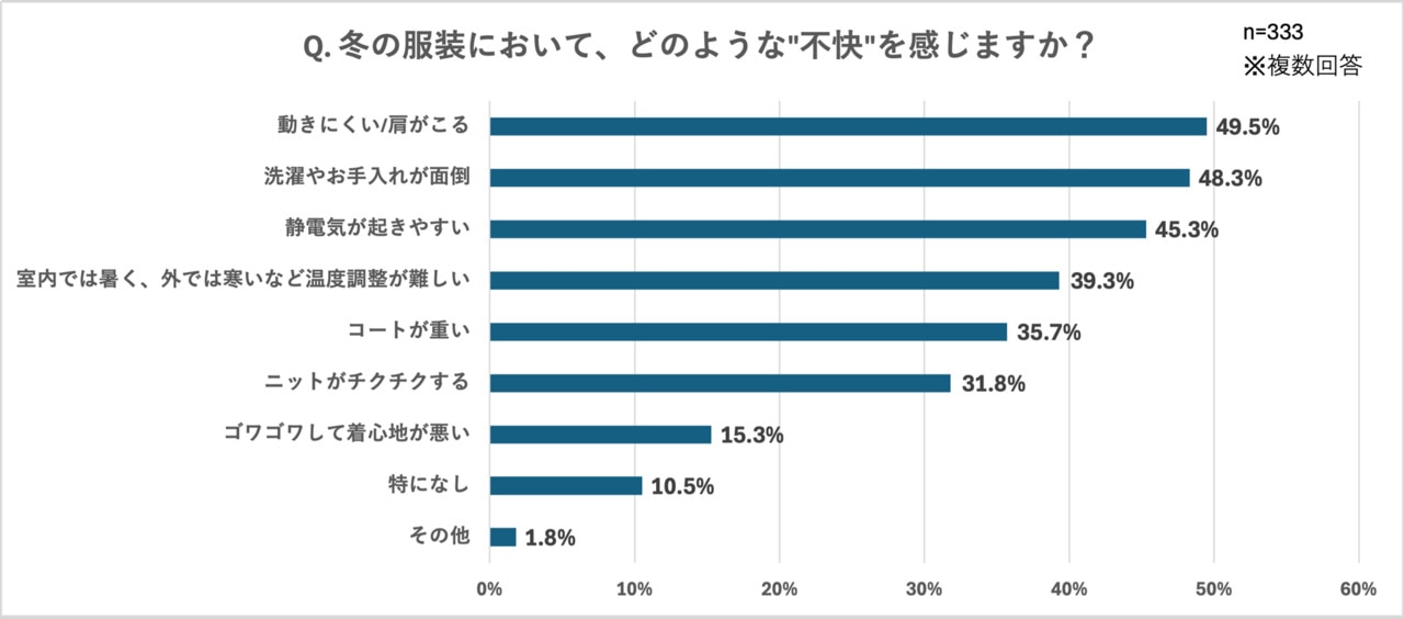 また、「冬の服装において、どのような"不快"を感じますか?」という質問には、「動きにくい/肩がこる(49.5%)」と約半数の人が回答しており、
