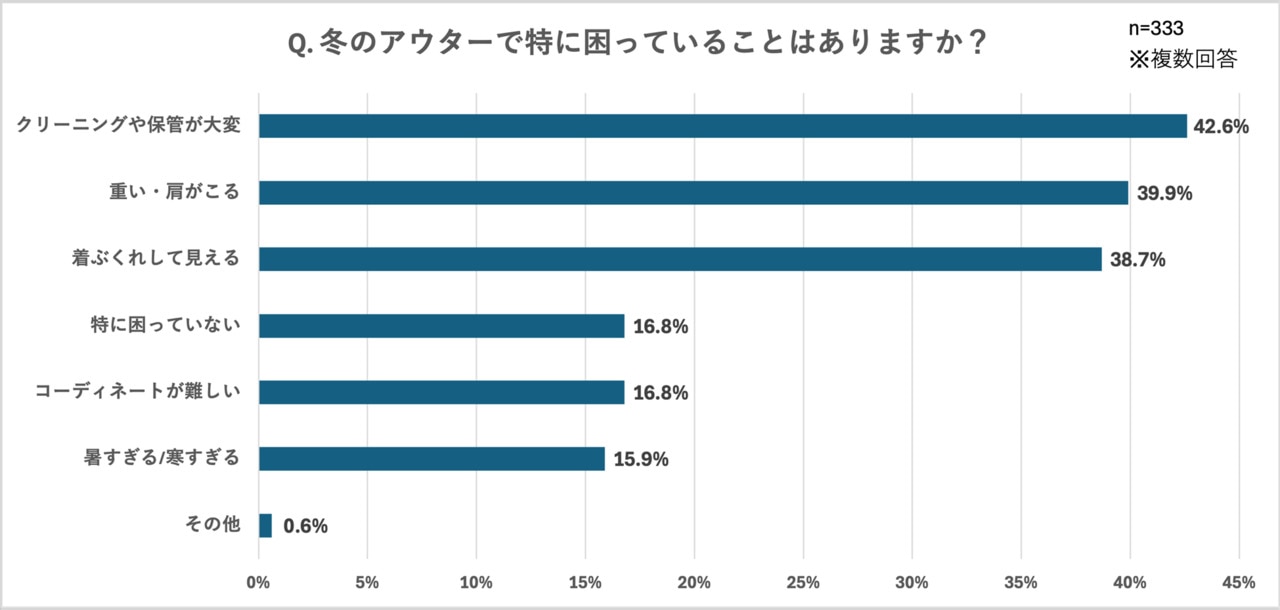 さらに「冬のアウターで特に困っていることはありますか?」という質問に対しても「重い・肩がこる(39.9%)」や「着ぶくれして見える(38.7%)」など、着心地に関する悩みが多いことがわかりました。